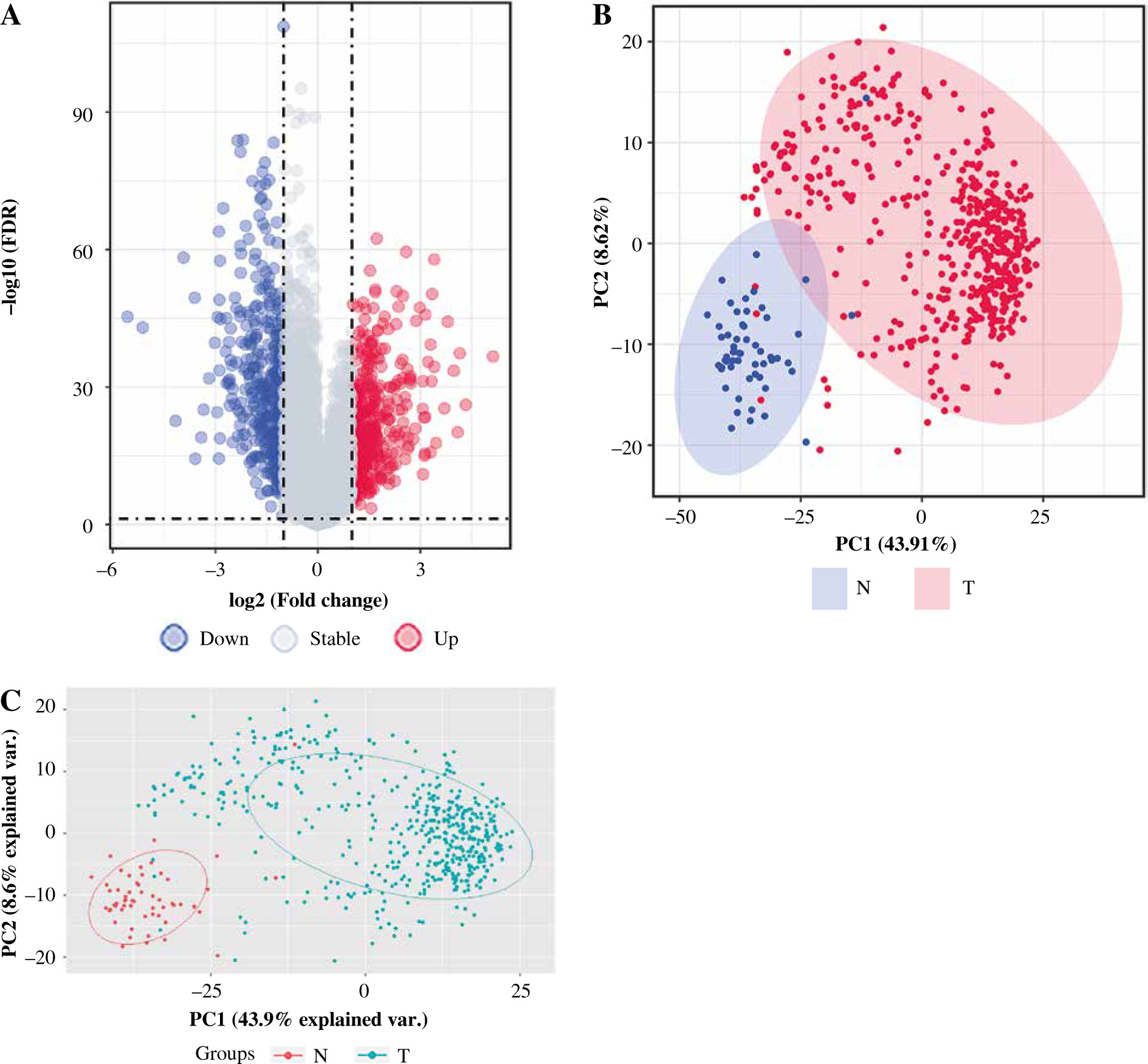 The limma package of R [16] was used to explore the DEGs between the THCA group and N group based on the TCGA Thyroid cancer dataset. The Benjamini & Hochberg (BH) adjusted p < 0.05 and |log2 fold change (FC)| > 1 were selected as the thresholds for DEG screening. The volcano plots visualized the results using ggplot2 (version: 1.0.12) [17]. Then, clustering heatmap analysis of TCGA THCA with DEGs was performed to detect the diagnostic effect of DEGs using ggplot2 (version: 1.0.12) [17]. Finally, principal component analysis (PCA) was further used to investigate the classification effect of DEGs.