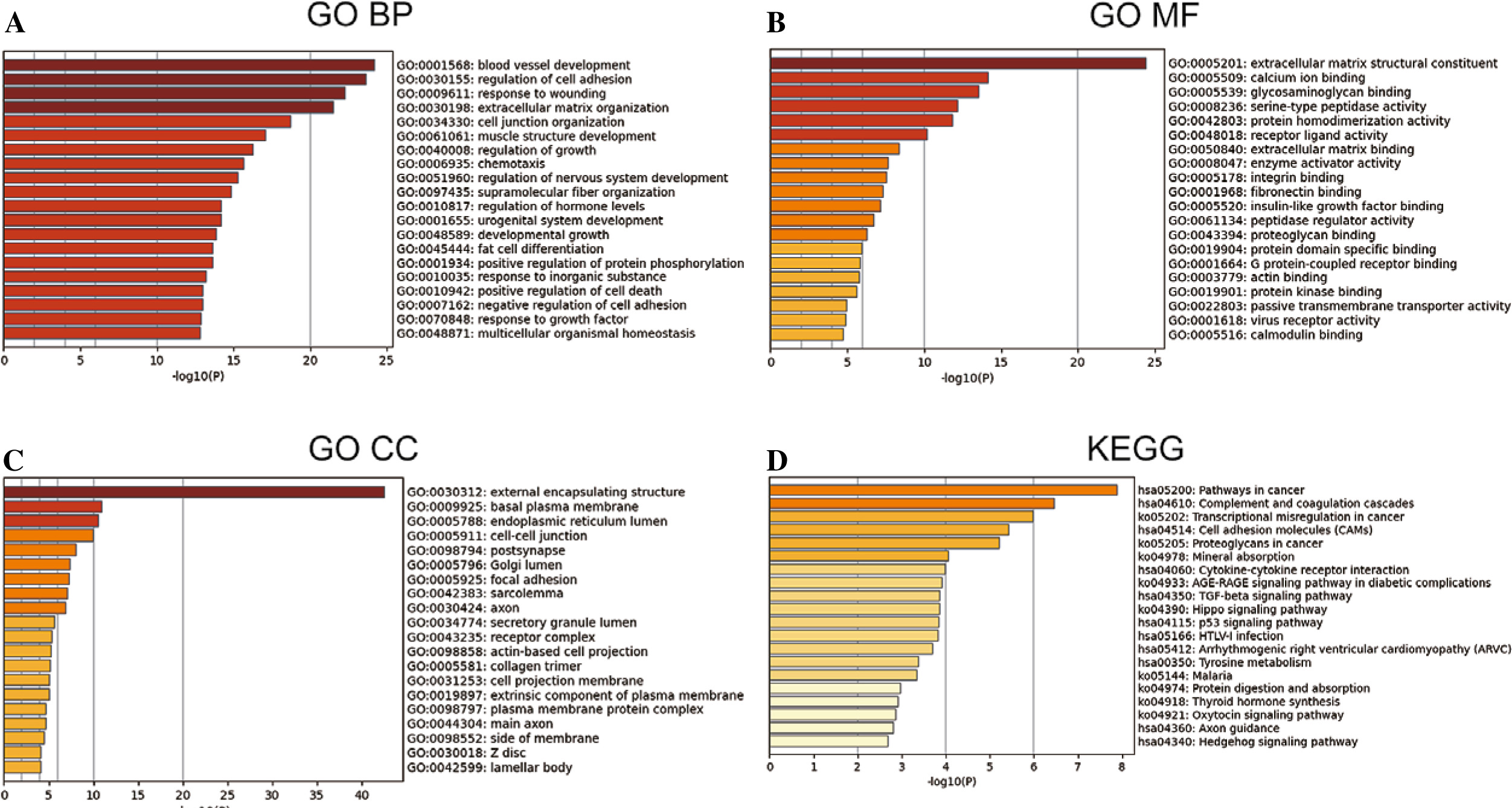 The 802 DEGs revealed in this study were mainly assembled in GO functions such as blood vessel development (BP, GO:0001568) (Fig. 2A), external encapsulating structure (CC, GO:0030312) (Fig. 2B), and extracellular matrix structural constituent (MF, GO:0005201) (Fig. 2C). Meanwhile, these DEGs were mainly enriched in KEGG pathways such as pathways in cancer (hsa05200), complement and coagulation cascades (hsa04610), and transcriptional misregulation in cancer (hsa04514) (Fig. 2D). The detailed information for all included GO functions and KEGG pathways is listed in Table 1.