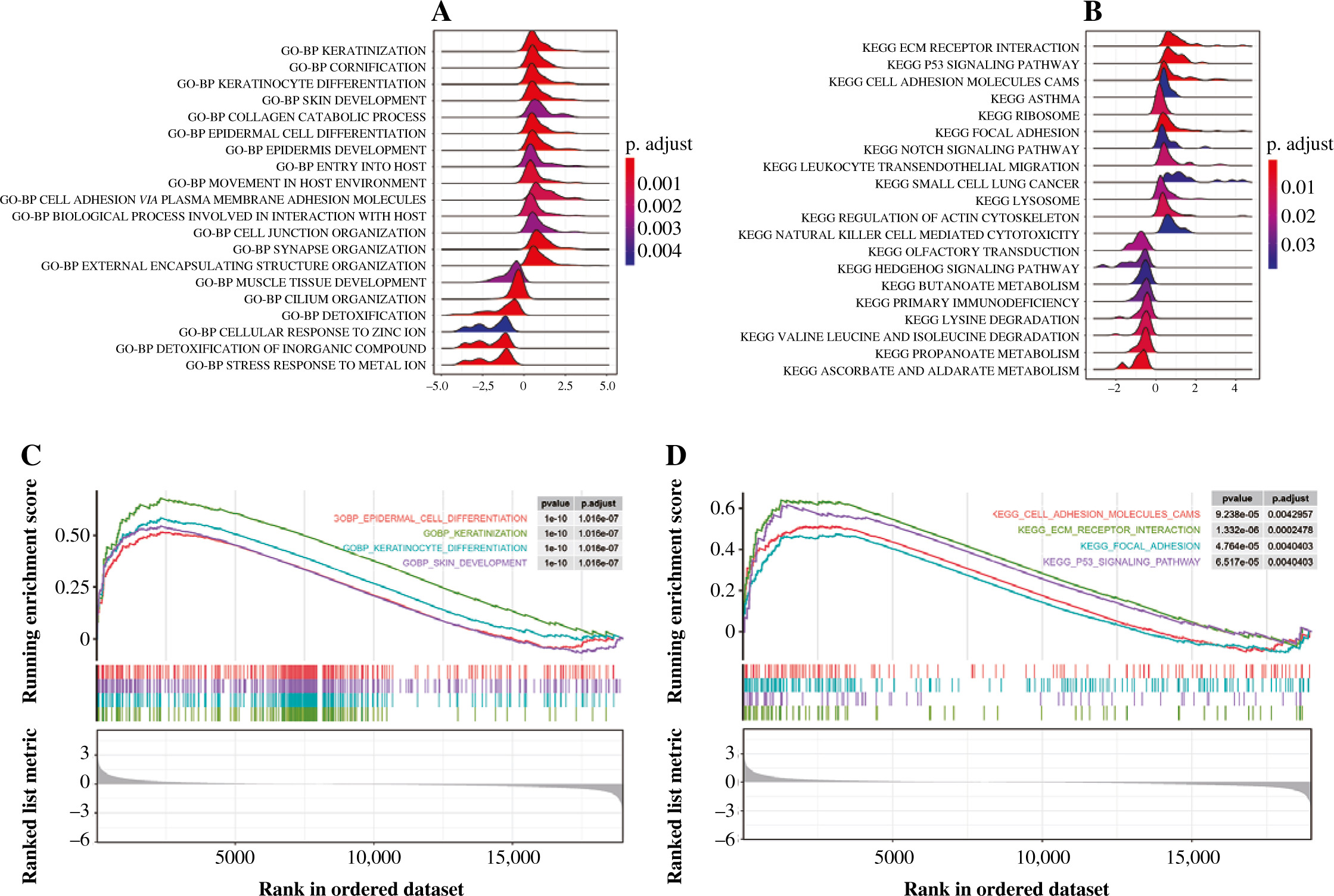 Gene set enrichment analysis (GSEA). A) The ridge plot for top 20 GO-BP terms assembled by DEGs between the THCA group and N group. B) The ridge plot for the top 20 KEGG pathways enriched by DEGs between the THCA group and N group. C) The GSEA plot for the top 20 GO-BP terms assembled by DEGs between the THCA group and N group. D) The GSEA plot for the top 20 KEGG pathways enriched by DEGs between the THCA group and N group