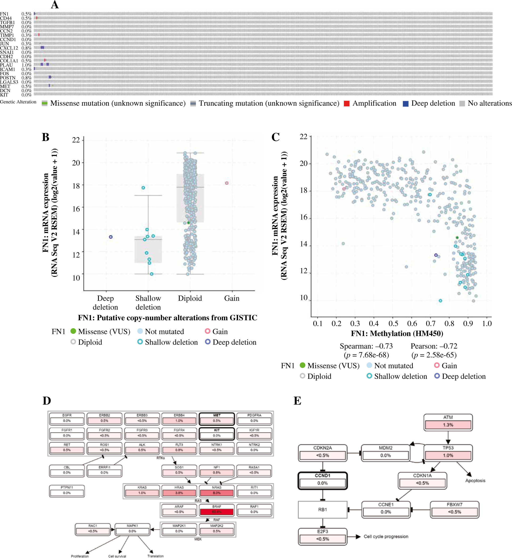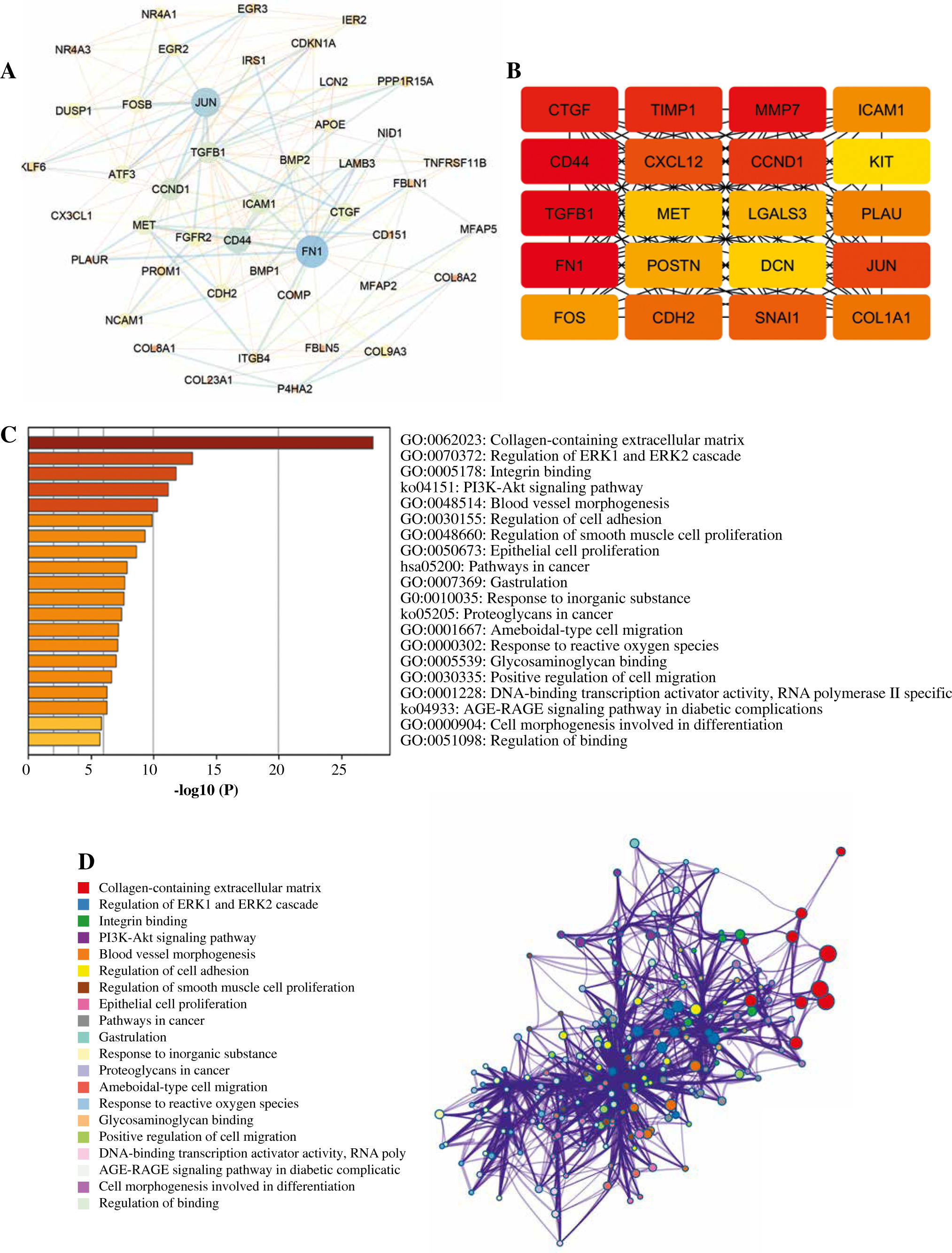 A PPI network was constructed based on 802 DEGs. Then, according to MCODE, the module with a score > 10 in the PPI network was selected (Fig. 4A). Finally, the top 20 hub genes including FN1, CD44, TGFB1, MMP7, CTGF, TIMP1, CCND1, JUN, CXCL12, SNAI1, etc., were revealed to play important roles in THCA (Fig. 4B). Then, these genes were mainly assembled in GO functions such as collagen-containing extracellular matrix (genes: FN1, TGFB1, etc.) and KEGG pathways including PI3K-Akt signaling pathway (genes: FN1, CCND1, etc.) (Fig. 4C, D).