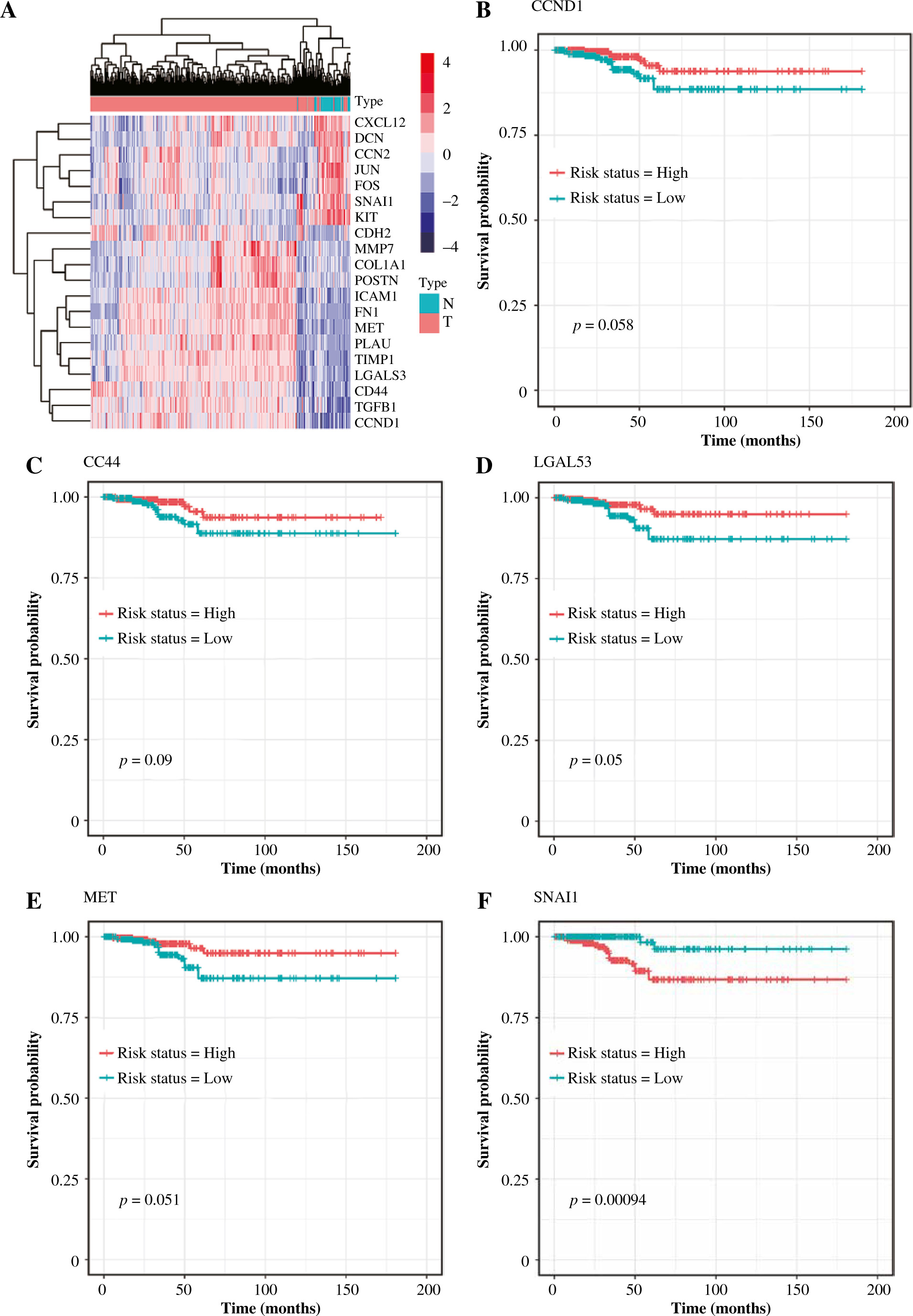Survival analysis for 20 hub genes. A) The hierarchical clustering map for all 20 hub genes: the red block represents up-regulated genes, while the blue block represents down-regulated genes. B-F) The KM plot for the potential prognostic genes including CCND1, CD44, LGALS3, MET, and SNAI1: the red line represents high risk, while the blue line represents low risk. N – normal, T – thyroid cancer