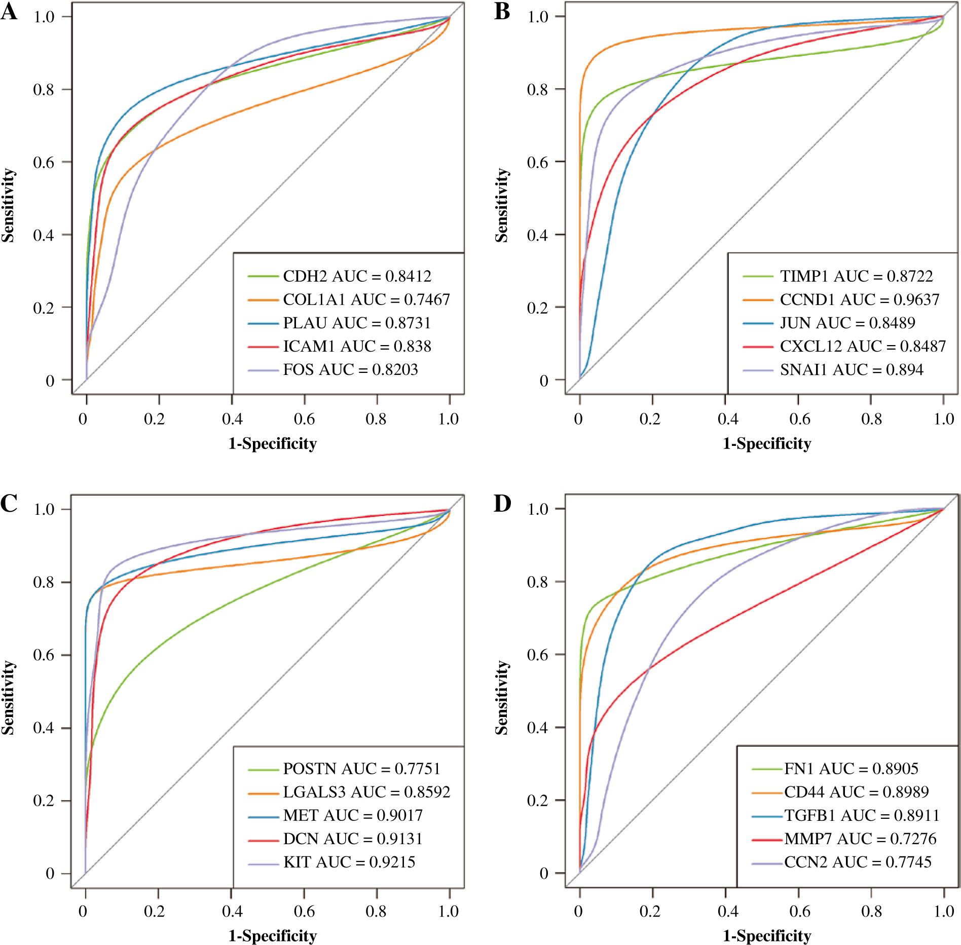 Thyroid cancer is the most common malignant tumor that frequently has genetic alterations leading to the activation of certain signaling pathways [30]. In this study, we successfully identified 802 DEGs and explored their biological functions through enrichment analyses. Additionally, we identified 20 hub genes, including FN1, CD44, TGFB1, MMP7, CTGF, TIMP1, CCND1, JUN, CXCL12, SNAI1, and others that may play essential roles in thyroid cancer development and progression. Notably, CCND1, MET, DCN, and KIT showed good prognostic predictive ability. We also analyzed the correlation between hub genes and immune cell infiltration.