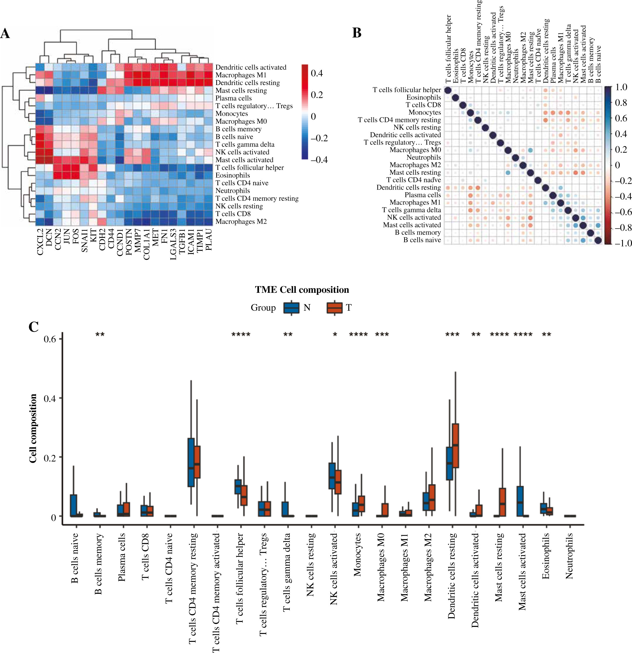 Immune cell infiltration investigation. A) Correlation analysis between 22 kinds of immune cell infiltration and hub gene: red represents positive correlation, while blue represents negative correlation. B) Correlation heatmap of 22 kinds of immune cell infiltration: blue represents positive correlation, while red represents negative correlation; the darker the color, the stronger the correlation. C) The box plot of 22 kinds of immune cell infiltration ratio: red represents the disease group, while blue represents the normal group. *p < 0.05, **p < 0.01, ***p < 0.001, ****p < 0.0001; N – normal, T – thyroid cancer