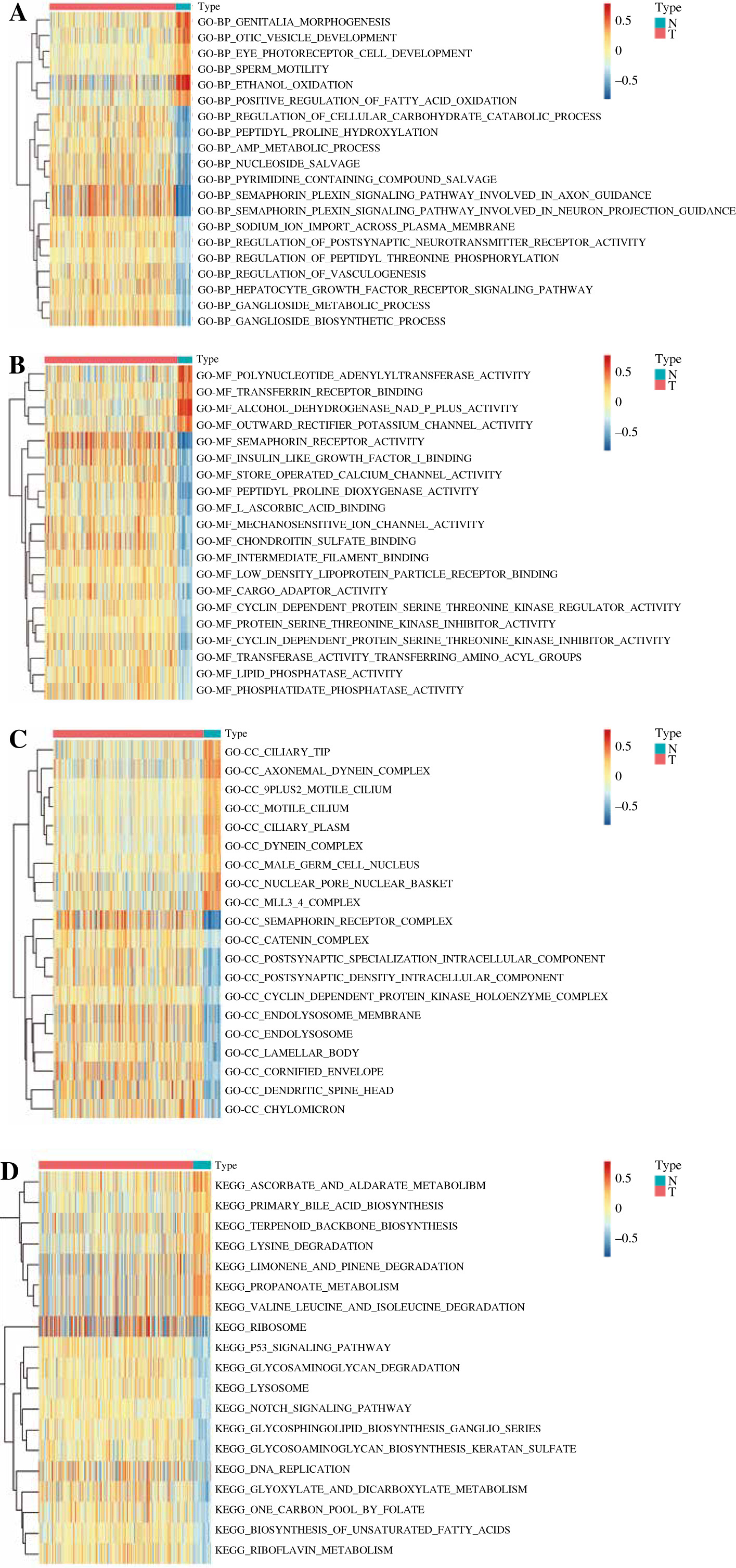 GSVA was performed based on all GO functions and KEGG pathways to explore the functions of prognostic genes in high- and low-risk groups with p < 0.05 and |log2FC| > 0.5. The results showed that a total of 20 GO-BPs including the semaphorin plexin signaling pathway involved in axon guidance and the semaphorin plexin signaling pathway involved in neuron projection guidance were significantly different between the two groups (Fig. 9A). Moreover, a total of 20 GO-MFs such as alcohol dehydrogenase and p plus activity, and semaphorin receptor activity were significantly different between the two groups (Fig. 9B). In addition, a total of 20 GO-CC including semaphorin receptor complex and postsynaptic specialization intracellular component were significantly different between the two groups (Fig. 9C). Furthermore, a total of 19 KEGG pathways such as the Notch signaling pathway and p53 signaling pathway were significantly different between the two groups (Fig. 9D).