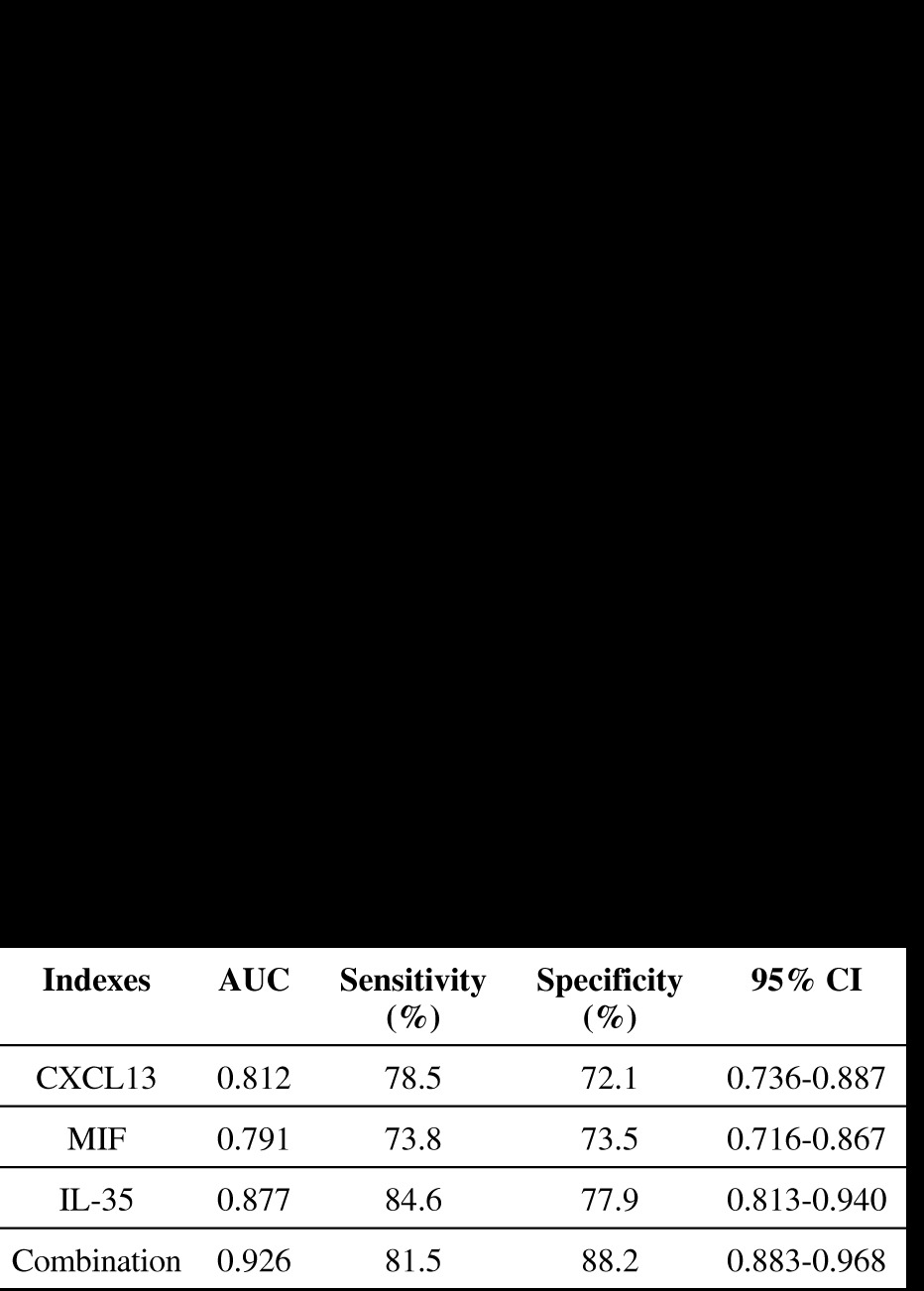 ROC curve analysis was used to evaluate the ability of CXCL13, MIF, IL-35, and their combination to distinguish patients with PSS-ILD from pSS. As shown in Figure 2, the AUC value of the combined detection curve of the three indexes was 0.926, and the sensitivity and specificity were 81.5% and 88.2%, respectively, which are better than those of other indexes separately.