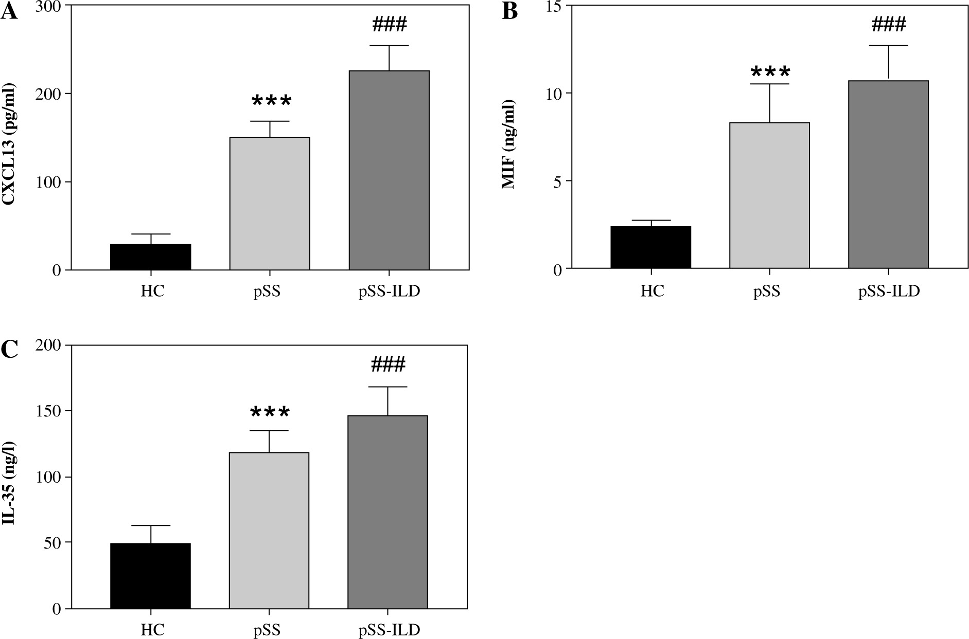 Saliva expression of CXCL13, MIF, IL-35. A) Saliva expression of CXCL13 in healthy controls, pSS group, and pSS-ILD group. B) Saliva expression of MIF in healthy controls, pSS group, and pSS-ILD group. C) Saliva expression of IL-35 in healthy controls, pSS group, and pSS-ILD group. ***p < 0.001 vs. HC, ###p < 0.001 vs. pSS group