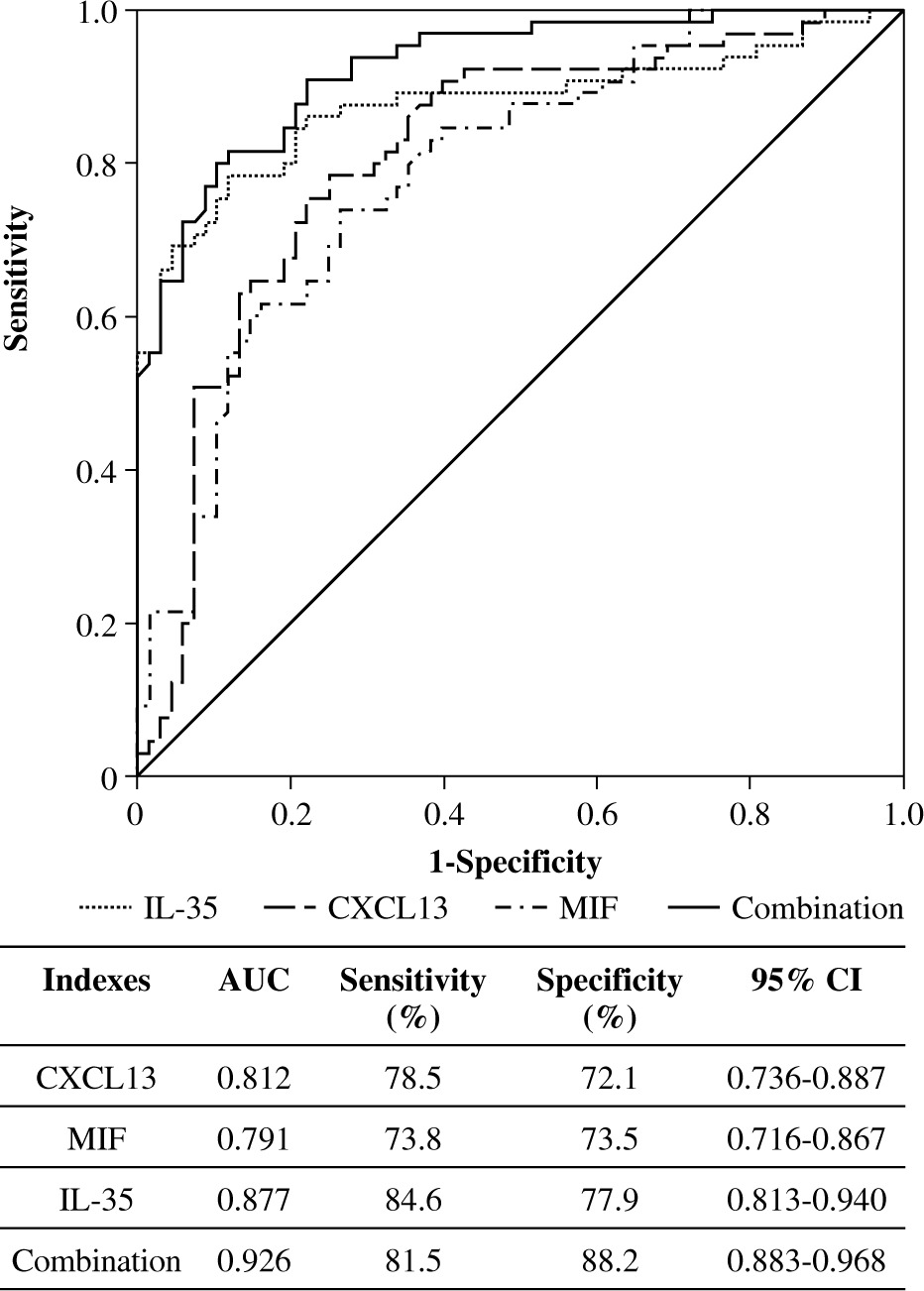 ROC curve analysis was used to evaluate the ability of CXCL13, MIF, IL-35, and their combination to distinguish patients with PSS-ILD from pSS. As shown in Figure 2, the AUC value of the combined detection curve of the three indexes was 0.926, and the sensitivity and specificity were 81.5% and 88.2%, respectively, which are better than those of other indexes separately.