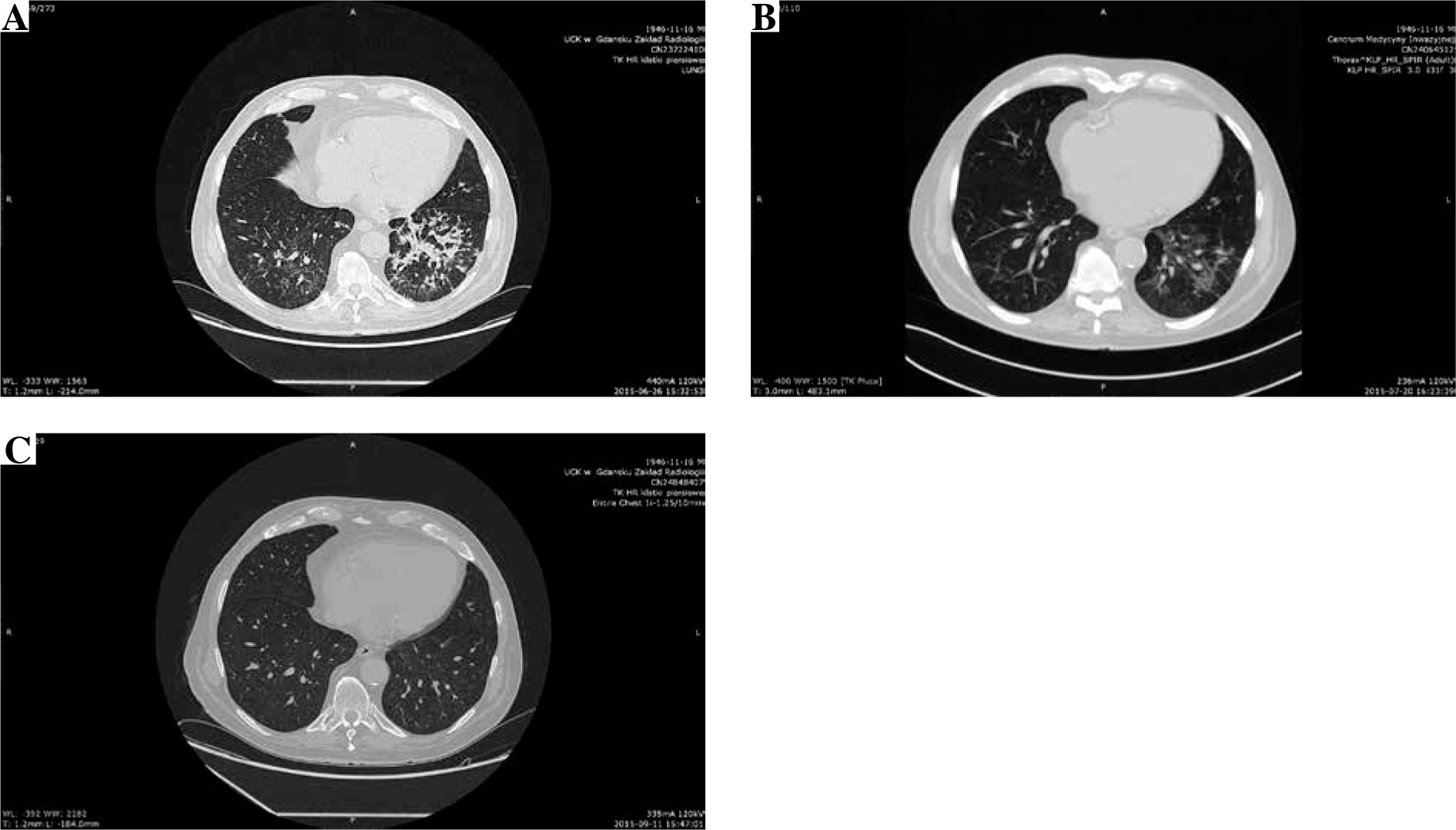 A) Initial computed tomography (CT) of the lungs shows poorly defined bilateral patchy consolidations without pleural effusion, B) chest CT after 3-week antibiotic treatment and everolimus (EVR) dose reduction shows only partial resolution of bilateral patchy consolidations, C) CT performed 10 weeks after EVR discontinuation shows complete resolution of symptoms