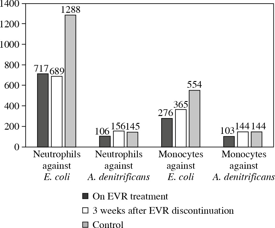 The ex vivo phagocytic activity (Fig. 2) and intensity of oxidative burst (Fig. 3) measured by the mean fluorescent intensity (MFI) of neutrophils and monocytes against E. coli and A. denitrificans were assessed using patients’ cells collected on EVR (2.8 ng/ml) and using patient cells collected 3 weeks after EVR discontinuation, and using cells from a healthy control.