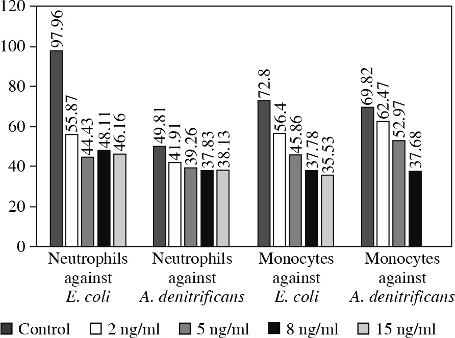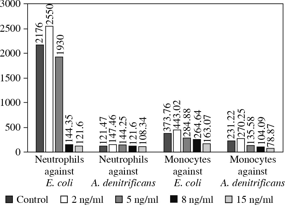 To confirm the aforementioned EVR properties we performed a similar assay in vitro using peripheral blood neutrophils and monocytes from a healthy donor. These cells were exposed to four different concentrations of EVR, ranging from 2 to 15 ng/ml (2 ng/ml, 5 ng/ml, 8 ng/ml and 15 ng/ml). The processes of phagocytosis and oxidative burst generation against both A. denitrificans and E. coli were again significantly affected by increasing doses of EVR in a dose-dependent manner (Figs. 4 and 5).