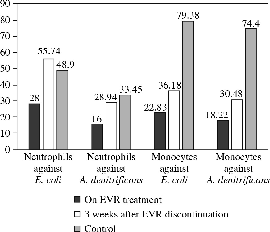 The ex vivo phagocytic activity (Fig. 2) and intensity of oxidative burst (Fig. 3) measured by the mean fluorescent intensity (MFI) of neutrophils and monocytes against E. coli and A. denitrificans were assessed using patients’ cells collected on EVR (2.8 ng/ml) and using patient cells collected 3 weeks after EVR discontinuation, and using cells from a healthy control.