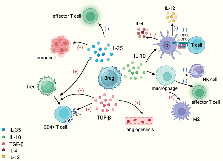Breg promote tumor development by secreting immunosuppressive cytokines. Breg secrete IL-10, make DC overexpress IL-4 and reduce production of IL-12, downregulate CD80/CD86 expression on DC surface and thereby reduce T cell activation, and also promote differentiation of tumor-associated macrophages into the M2 phenotype and ultimately suppress effector T cells and NK cells. IL-35 secreted by Breg can promote the differentiation of T cells into Treg cells, induce effector T-cell depletion, and inhibit apoptosis of tumor cells. TGF-β secreted by Breg can transform CD4+ T cells into Treg and is also able to induce angiogenesis