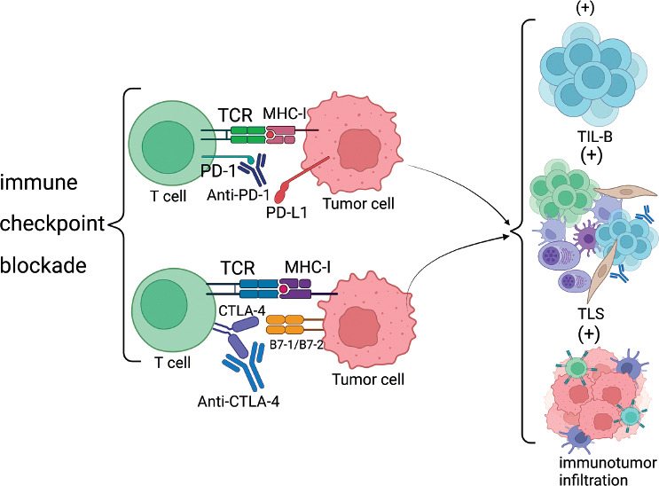 It has been shown that targeting immune checkpoint blockade with PD-1 or PD-L1 may directly affect TIL-B. There is substantial evidence that anti-CTLA-4 and anti- PD-1 antibody blockade has a positive effect on TIL-B and TLS. In a mouse melanoma model constructed by researchers, blockade of immune checkpoints was found to improve the number and characterization of TLS, along with a greater improvement in the efficacy of melanoma [52]. In other tumor models, an increase in the number of TLS and improved tumor control after treatment with anti-PD-1 antibody were also observed. This also demonstrates that immune checkpoint blockade can offer a new approach for the treatment of tumors.