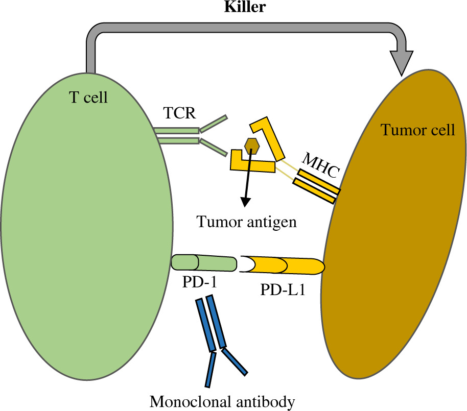 Mode of action of monoclonal antibody. Anti-PD-1/PD-L1 antibody suppresses interaction between PD-1 and PD-L1. Generally, tumoricidal function of T cells can be hindered by PD-1 and PD-L1. However, monoclonal antibodies overcome this inhibitory effect. Consequently, T cells kill the tumor cells by receiving tumor antigens from MHC via TCR. PD-1 – programmed cell death-1, PD-L1 – programmed cell death ligand-1, TCR – T cell receptor, MHC – major histocompatibility complex