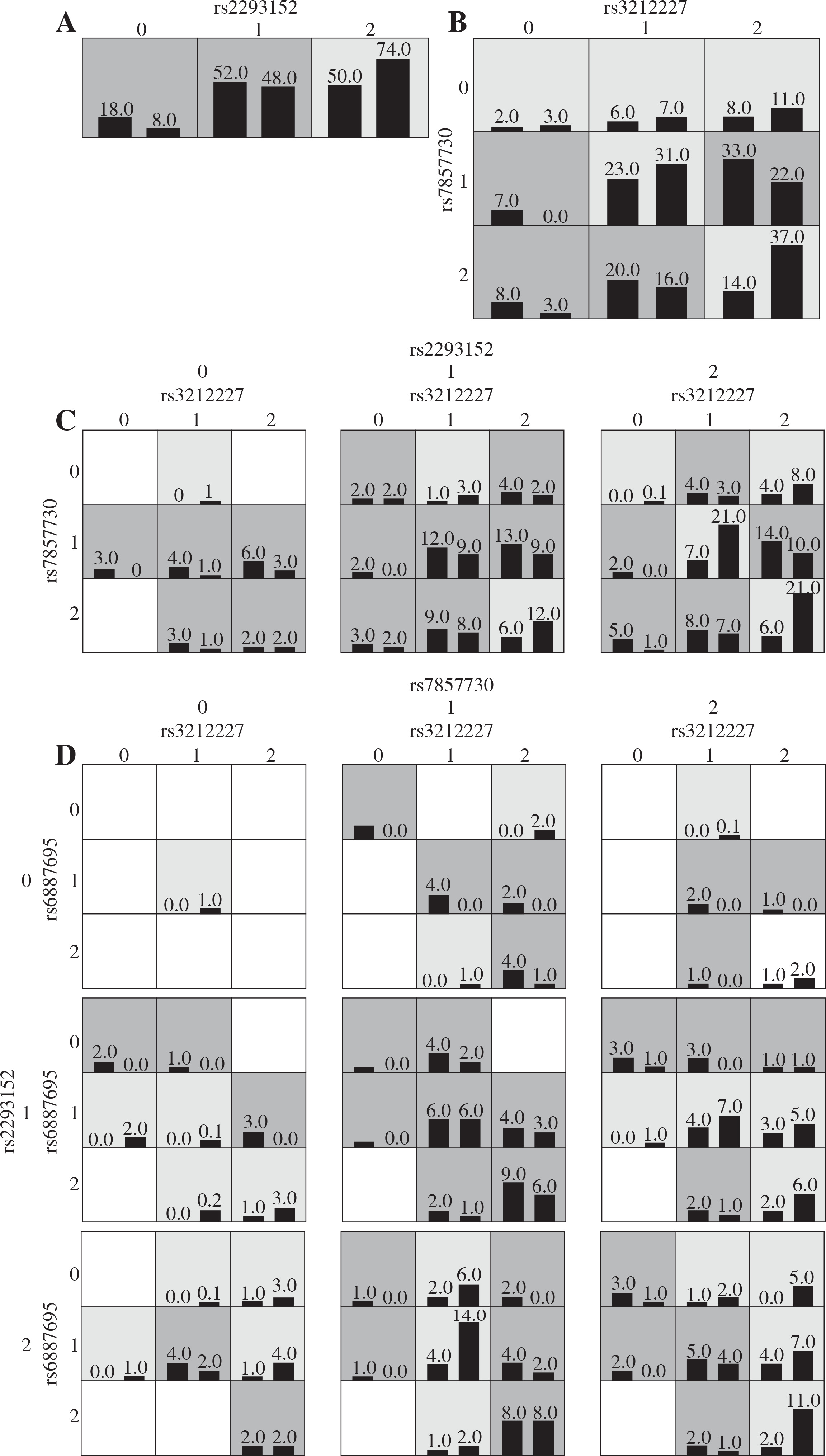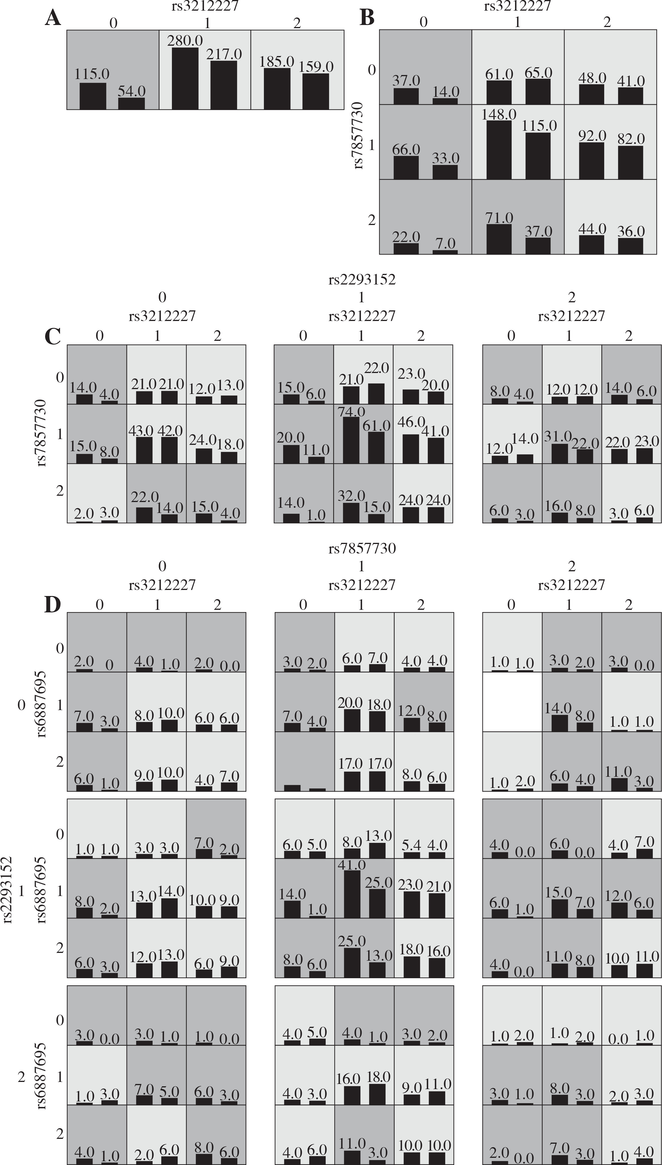 Graphic models determined by multifactor dimensionality reduction (MDR), representing the following different interactions in the Chinese cohort: A) IL-12β rs3212227, B) IL-12β rs3212227 and JAK2 rs7857730, C) IL-12β rs3212227, JAK2 rs7857730, and STAT3 rs2293152, D) IL-12β rs3212227, IL-12β rs6887695, JAK2 rs7857730, and STAT3 rs2293152. SNP genotypic values range from 0 to 2 (0 = zero risk allele, 1 = one risk allele, 2 = two risk alleles). Each cell shows counts of “Class 1 = unaffected” on the left and “Class 2 = affected” on the right, and shades on cells represent the risk degree of the disease (dark cell = high risk, light cell = low risk)