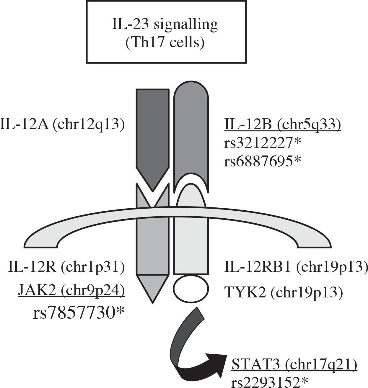 Schematic representation of the three candidate genes and the four tag SNPs selected for this study in the IL-23 signalling pathway (SNPs rs3212227 and rs6887695 in IL-12β, SNP rs7857730 in JAK2, and SNP rs2293152 in STAT3)
