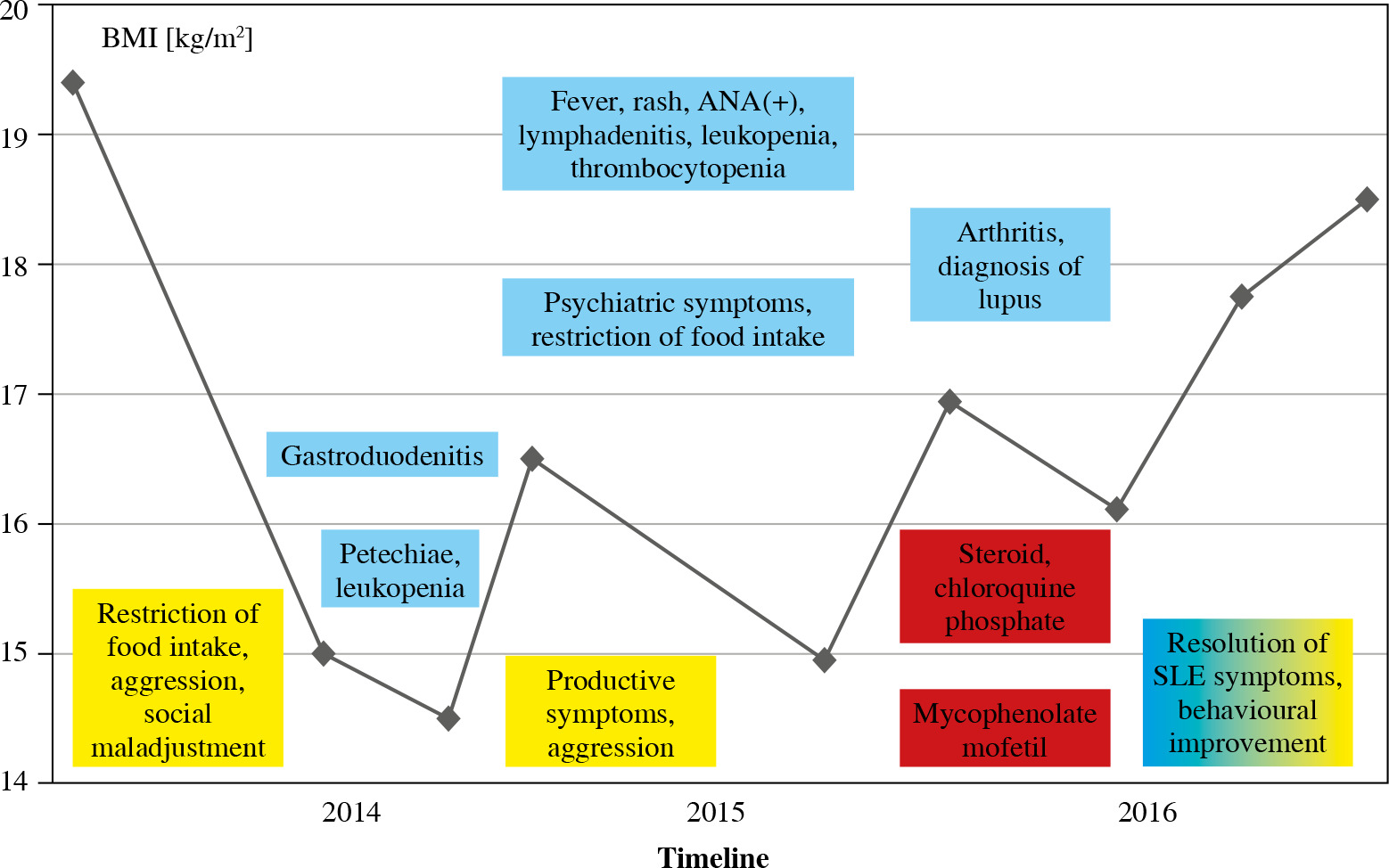 The first alarming symptoms of an eating disorder occurred in May 2014 when the girl restricted food intake. Two years later the patient was finally diagnosed with concomitant SLE, the symptoms of which had been previously reported. The sequence of symptoms combined with the patient’s body mass index (BMI) is given in Figure 1. The subject almost completely refused to eat and drink at the end of 2014 and presented with behavioural disorders (vulgarity, impulsiveness, disinhibition), self-injurious behaviour and suicidal thoughts. In June 2015, the patient’s body weight decreased from 46 to 36 kg (< 3rd percentile) while her height was 155 cm.