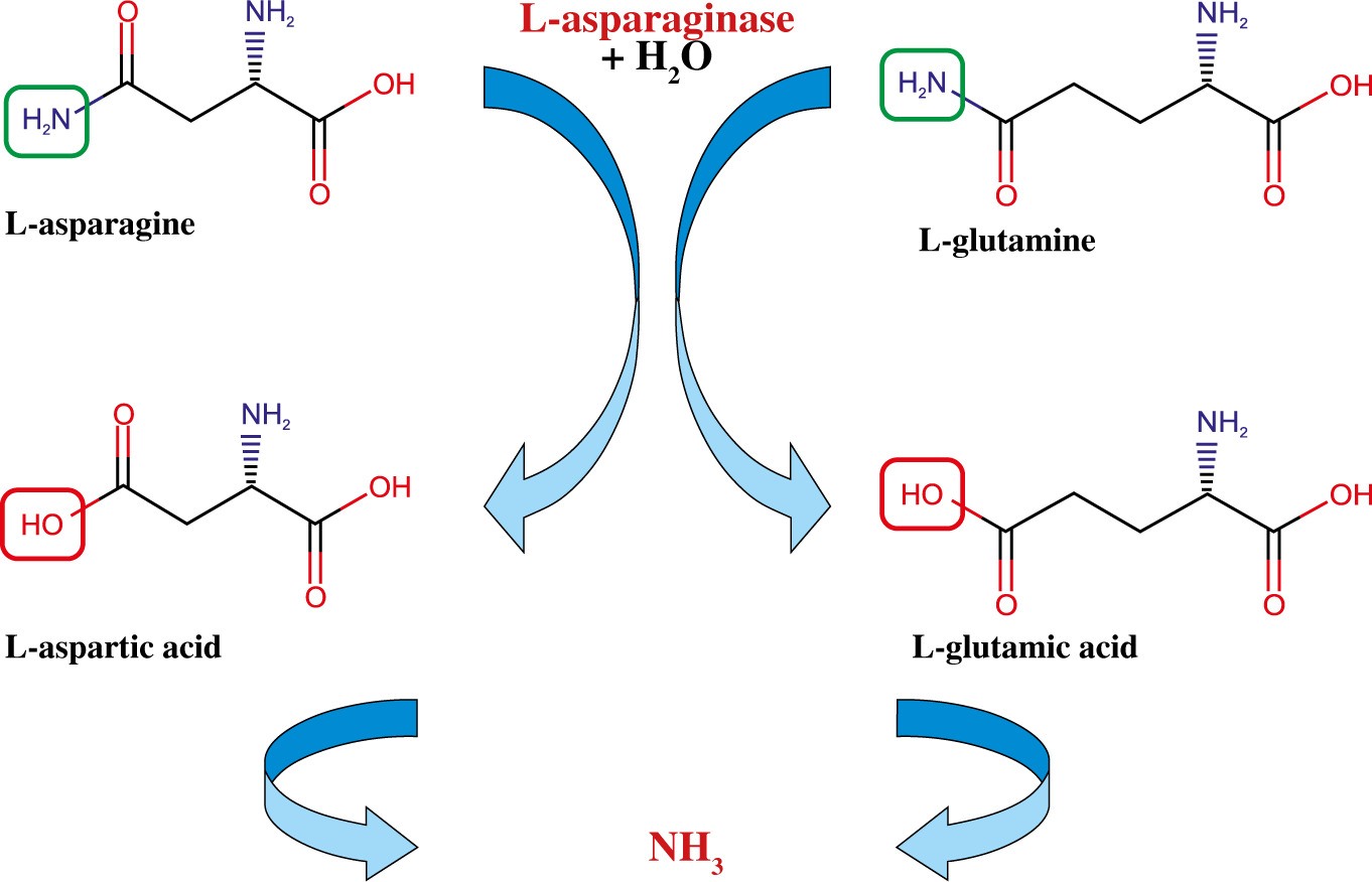 Schematic illustration of the dual activities of bacterial L-asparaginase. (-NH2) – amino group, (-OH) – hydroxyl group, O – oxygen, H2O – water, NH3 – ammonia