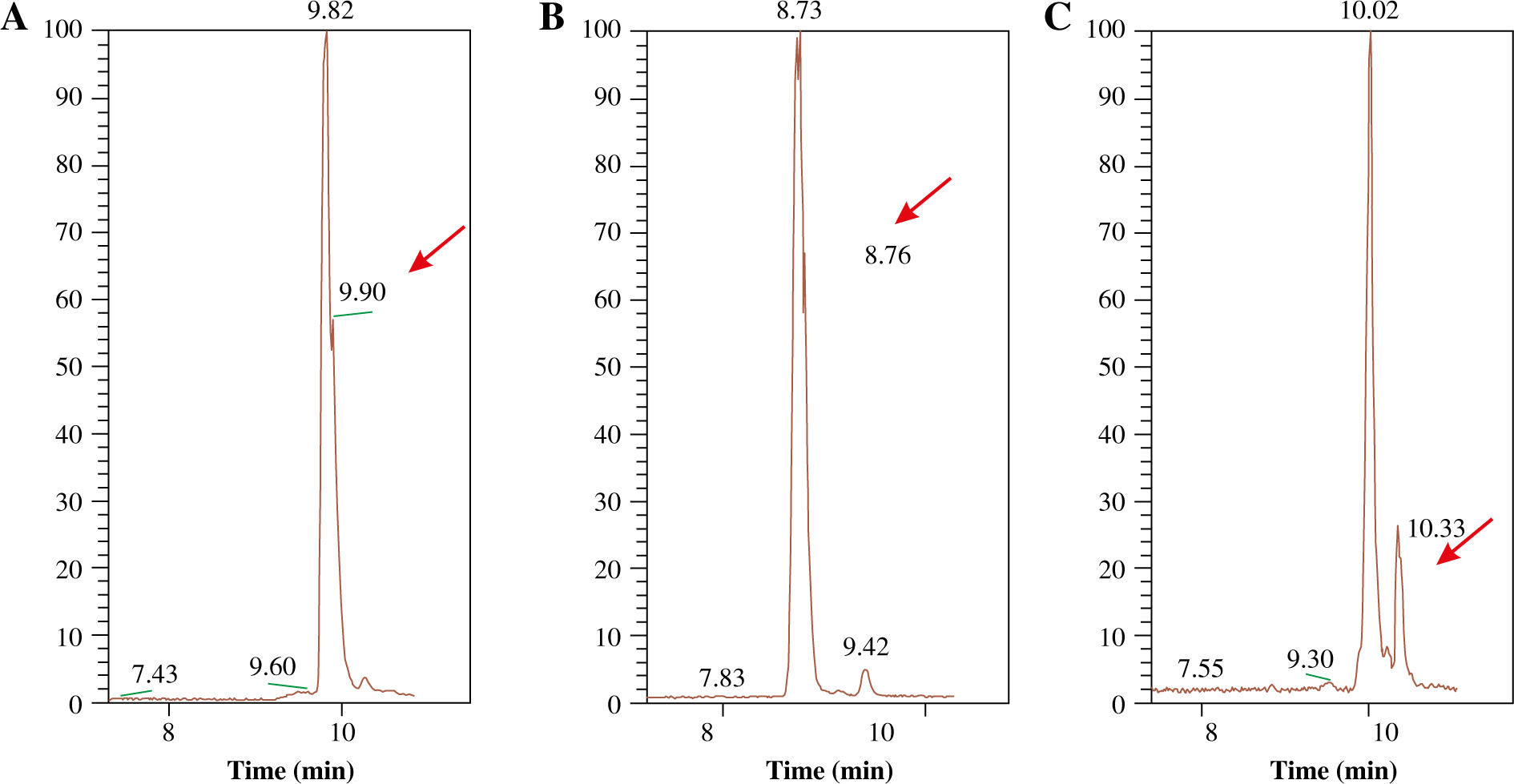 Treated huCII was collected from the 50K centrifugal filter. Protein concentrations of the treated and non-treated huCII were measured on a NanoDrop 2000 UV-Vis spectrophotometer (Thermo Fisher Scientific, Wilmington, DE, USA) and adjusted to 1 mg/ml in 100 mM Tris-HCl, pH 8.2 for further experiments. For the LC-MS analysis, one part of the collected CII peptide filtrates was diluted 11 times with ultrapure water and 0.3 µl was injected into the chromatographic system.