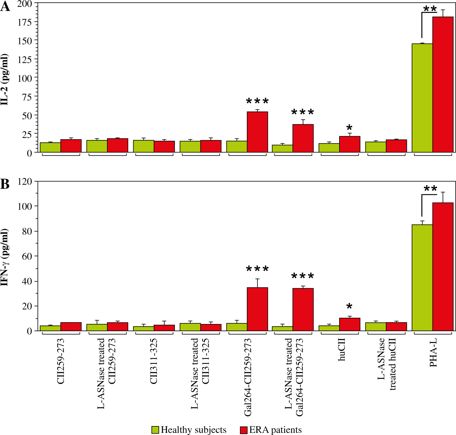 To assess whether the bacterial L-asparaginase-treated huCII and collagen peptides, which represent T-cell epitopes, could still induce a T-cell response, leukocytes from the same ERA patients and healthy individuals were stimulated with these antigens for 96 h. As depicted in Figure 3, only Gal264-CII259-273 (regardless of whether it was treated with the enzyme or not) and native huCII were able to induce IL-2 (Fig. 3A) and IFN-γ (Fig. 3B) secretion by the T cells. As expected, the other T cell epitope (CII311-325) cannot activate T cells because it is HLA-DRB1*10 restricted and the blood samples (or antigen-presenting cells) were from patients who express HLA-DRB1*04 molecules. The lack of difference in the T-cell response against non-modified and modified Gal264-CII259-273 leads to the conclusion that the investigated enzyme modification does not affect the amino acids responsible for the binding of the peptide to MHCII or to the T-cell receptor (TCR).