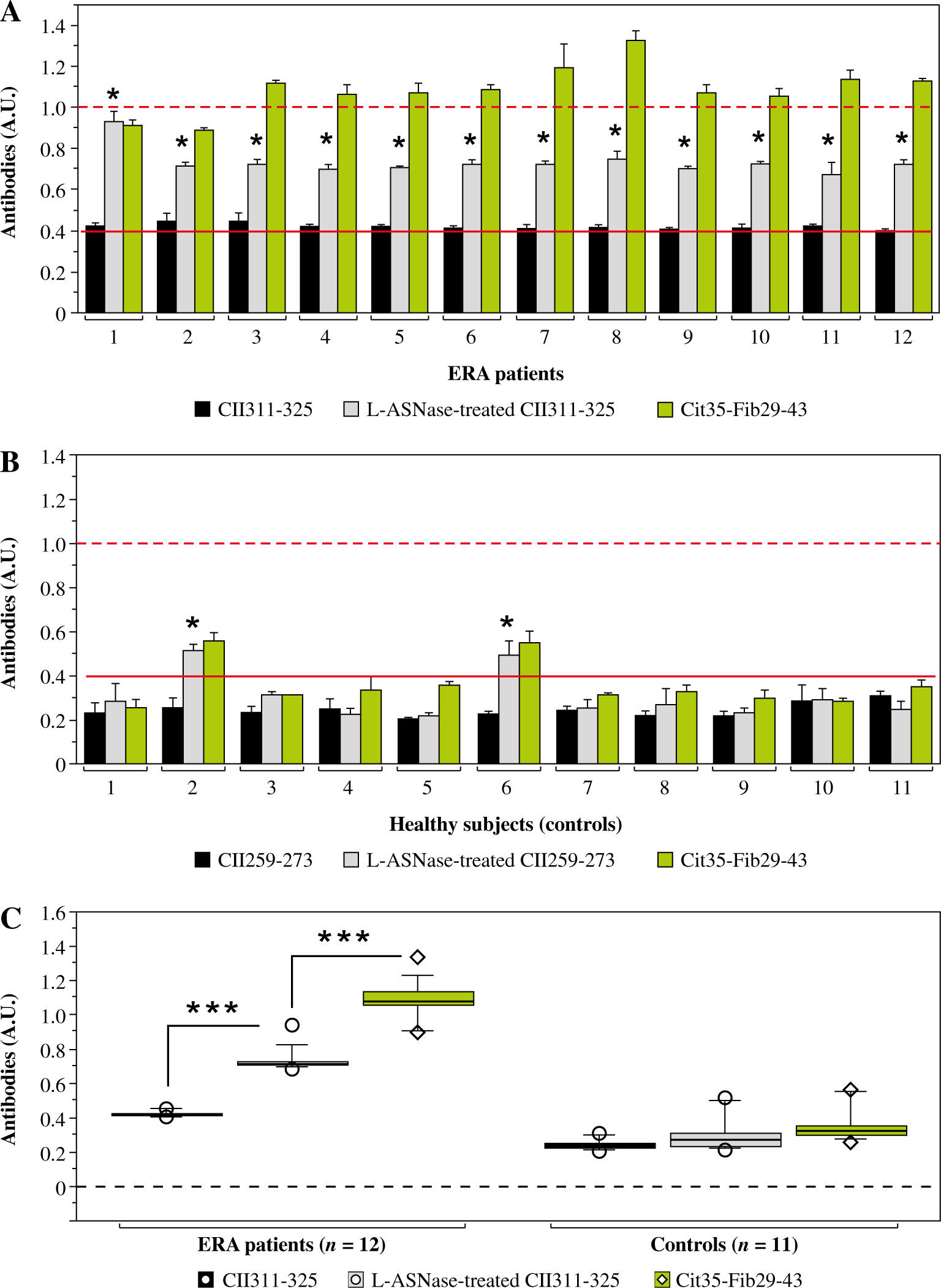 Reactivity of early rheumatoid arthritis (ERA) sera to non-modified CII311-325 peptide and L-ASNase-treated CII311-325 analyzed by ELISA. A linear Cit35-Fib29-43 peptide (AEGGGV[Cit]GPRVVERH) was used as a positive control. Sera from healthy subjects were used as negative controls. Red lines represent the cut-off thresholds based on the ROC curve (AUC) with the 95% confidence interval (CI). Dashed red lines show the maximal positive response of the normalized arbitrary units (A.U.). Results are presented as mean ± SE. *p < 0.05, ***p < 0.001, as determined by the Mann-Whitney U test (two groups) or Kruskal-Wallis test (three groups). Cit – citrulline residue, Fib – fibrinogen, ROC – receiver operating characteristic, AUC – area under the ROC curve