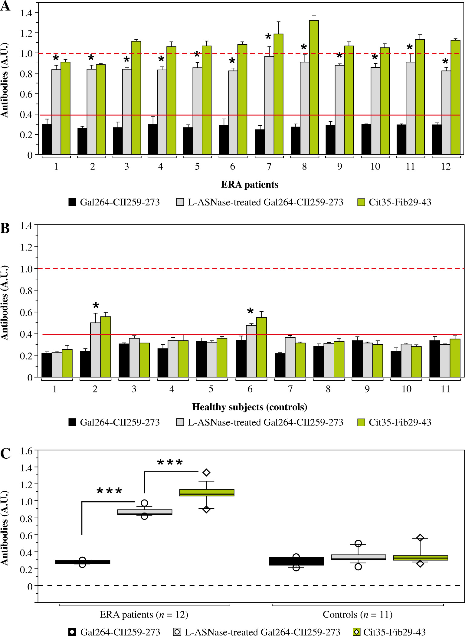Reactivity of early rheumatoid arthritis (ERA) sera to Gal264-CII259-273 peptide and L-ASNase-treated Gal264-CII259-273 analyzed by ELISA. A linear Cit35-Fib29-43 peptide (AEGGGV[Cit]GPRVVERH) was used as a positive control. Sera from healthy subjects were used as negative controls. Red lines represent the cut-off thresholds based on the ROC curve (AUC) with the 95% confidence interval (CI). Dashed red lines show the maximal positive response of the normalized arbitrary units (A.U.). Results are presented as mean ± SE. *p < 0.05, ***p < 0.001, as determined by the Mann-Whitney U test (two groups) or Kruskal-Wallis test (three groups). Cit – citrulline residue, Fib – fibrinogen, ROC – receiver operating characteristic, AUC – area under the ROC curve