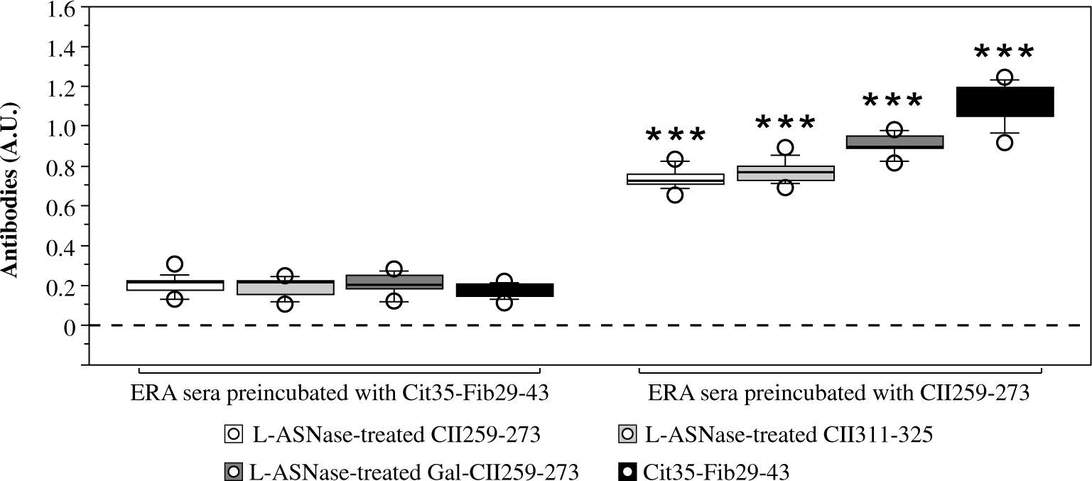 To assess whether the observed humoral response of RA serum samples to the enzymatically modified CII peptides is due to ACPAs or to other antibodies, we performed a competitive ELISA with a citrullinated peptide. No response was detected when the serum samples from ERA patients were preincubated with Cit35-Fib29-43 peptide (Fig. 7). In contrast, sera preincubated with an irrelevant peptide (CII259-273), which does not contain citrulline, reacted to L-ASNase-modified peptides and to the citrullinated peptide (Fig. 7). These results indicate that ACPAs cross-react with the modifications caused by the bacterial L-asparaginase.