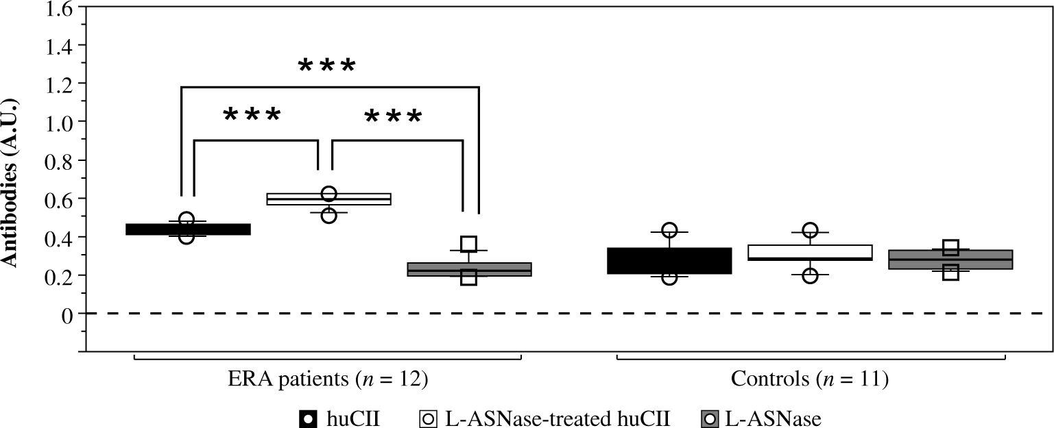 Reactivity of early rheumatoid arthritis (ERA) sera to native human collagen type II protein (huCII) and L-ASNase-treated huCII analyzed by ELISA. Bacterial L-asparaginase was used as a negative control. Sera from healthy subjects were used as negative controls. Results are presented as mean ± SE. ***p < 0.001, as determined by Kruskal- Wallis test