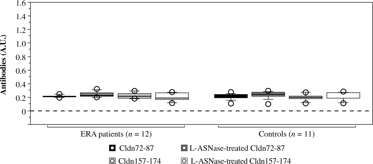 In order to investigate whether bacterial L-ASNase can create other B-cell epitopes recognized by antibodies from anti-CCP positive ERA patients, we treated in vitro with the enzyme two irrelevant peptides from the claudin-12 protein (Cldn72–87 TTWYSSVDQLDLRVLQ and Cldn157-174 YNIHLNKKFEPVFSFDYA) that contain glutamine or asparagine residues (targets for the L-ASNase). As can be seen in Figure 9, no anti- body reactivity was detected in either ERA patients or healthy controls. An explanation for these results could be that the main motif (carbonyl-Gly-Pro) recognized by ACPAs here is missing. Therefore, not all posttranslational modifications by bacterial L-ASNase lead to the creation of epitopes which are targets for ACPAs. Such antibody reactivity requires the presence of a “carbonyl-Gly-Pro” motif. This sequence occurs repeatedly in type II collagen.