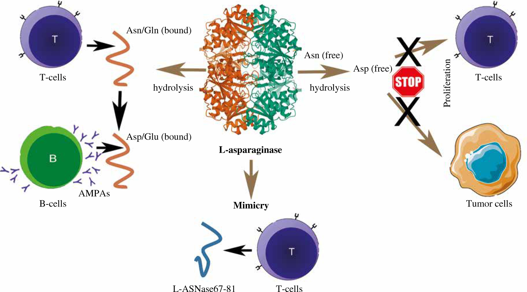 Summary of the L-asparaginase activities and mechanisms of action. Asn – Asparagine, Asp – aspartic acid, Gln – glutamine, Glu – glutamic acid, AMPAs – anti-modified protein antibodies