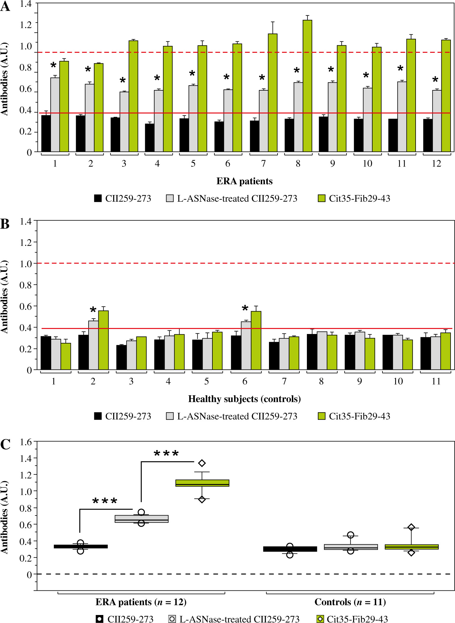 In our study, we detected increased levels of antibodies against L-ASNase-treated CII peptides and Cit35-Fib29-43 peptide (Figs. 4-6) in two healthy subjects (#2 and #6). Although the antibody levels were lower compared to those in ERA patients, these data demonstrate the prognostic value of the ACPAs concerning RA onset in asymptomatic subjects [17]. Since these healthy volunteers did not report the presence of other diseases, it will be interesting to follow them over the next few years to see if they will develop RA.