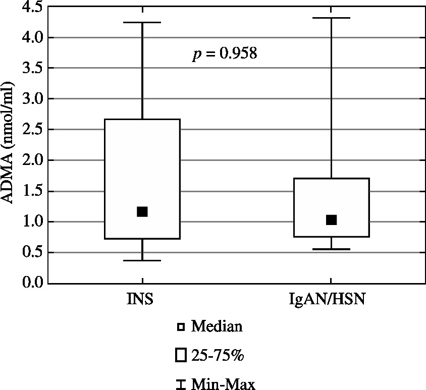Asymmetric dimethylarginine in children with idiopathic nephrotic syndrome and IgA nephropathy/Henoch-Schönlein nephropathy (ADMA – asymmetric dimethylarginine, INS – idiopathic nephrotic syndrome, IgAN/HSN – IgA nephropathy/Henoch-Schönlein nephropathy)