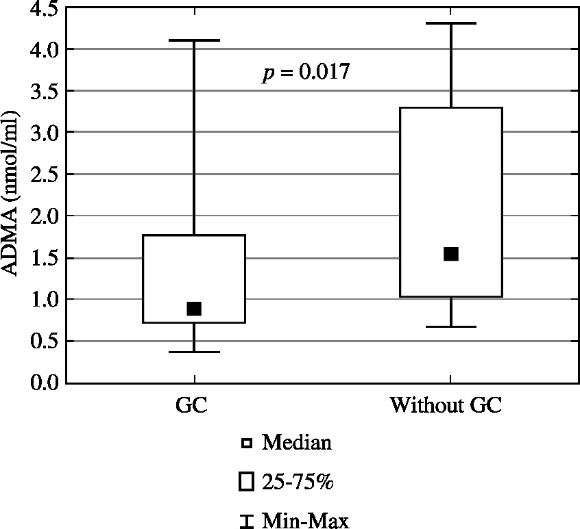 Asymmetric dimethylarginine in children with glomerular kidney diseases treated and not treated with glucocorticoids (ADMA – asymmetric dimethylarginine, GC – glucocorticoid)