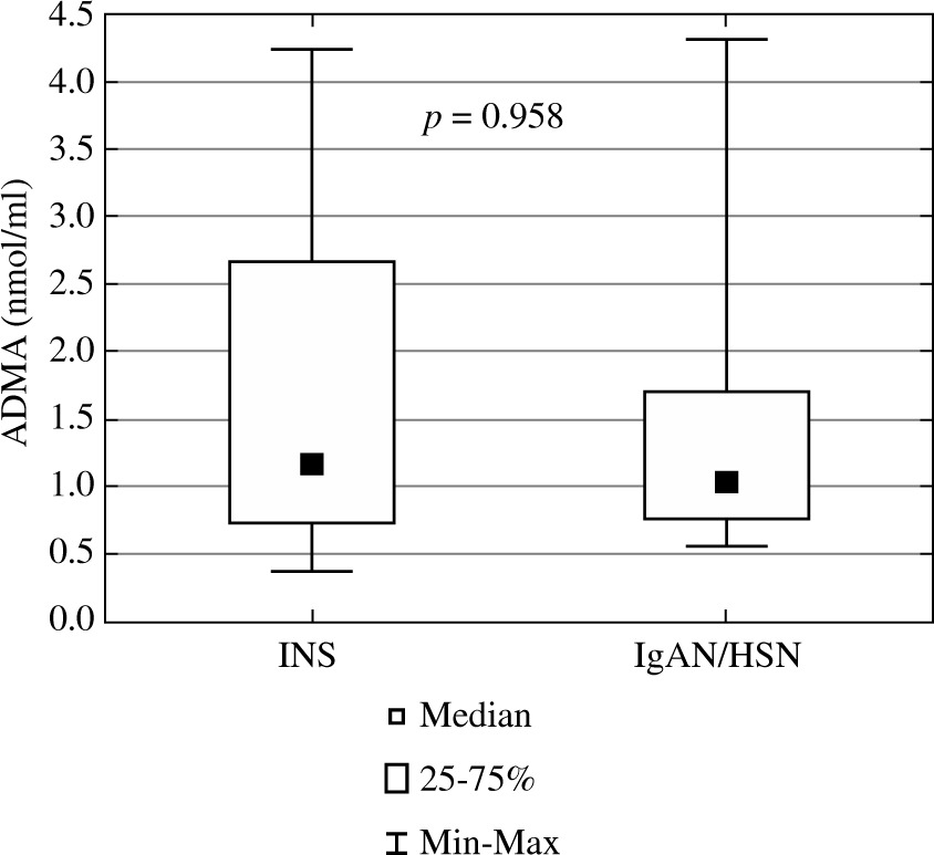 Asymmetric dimethylarginine in children with idiopathic nephrotic syndrome and IgA nephropathy/Henoch-Schönlein nephropathy (ADMA – asymmetric dimethylarginine, INS – idiopathic nephrotic syndrome, IgAN/HSN – IgA nephropathy/Henoch-Schönlein nephropathy)