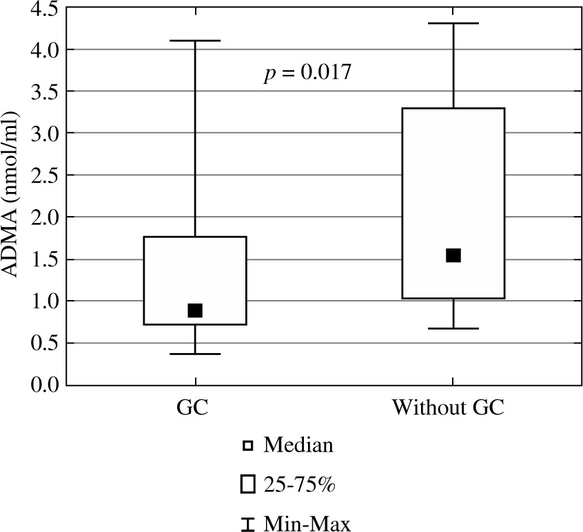Asymmetric dimethylarginine in children with glomerular kidney diseases treated and not treated with glucocorticoids (ADMA – asymmetric dimethylarginine, GC – glucocorticoid)
