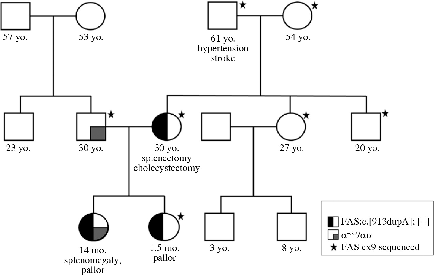 Autoimmune lymphoproliferative syndrome (ALPS) is a chronic non-malignant lymphoproliferative disorder caused by mutations in the genes involved in programmed cell death [1-4]. In the majority of patients, ALPS is due to inherited mutations in genes encoding proteins of the Fas pathway, which mediates programmed cell death or apoptosis. Several genetic defects are associated with ALPS. ALPS-FAS and ALPS-s FAS are caused by germline and somatic mutations, respectively, in the FAS gene [5-9]. In rare cases, ALPS is caused by mutations in the genes encoding the Fas ligand (ALPS-FASLG) or caspase 10 (ALPS-CASP10). It is inherited as an autosomal dominant pattern with variable penetrance. As a very rare disease, ALPS was first characterized in the early 1990s. The incidence and prevalence of ALPS are unknown. Estimated cases of ALPS worldwide exceed several hundred, but that number has not reliably been confirmed. Cases of ALPS probably remain undiagnosed due to variable phenotypic expression and a constellation of symptoms that overlap with many other conditions, particularly Evans syndrome and other lymphoproliferative disorders [10, 11]. Its clinical manifestations include: unexplained lymphadenopathy, hepatosplenomegaly, autoimmune cytopenia such as thrombocytopenia, neutropenia, and anemia due to excessive production of antibodies by lymphocytes, elevated number of double-negative T (DNT) cells, and increased risk of lymphoma [12-15]. The diagnostic approach to these patients tends to be broad and often includes imaging studies as well as invasive diagnostic procedures, such as biopsy of lymph nodes and/or other tissues. Molecular characterization of ALPS has resulted in revised diagnostic criteria, aiding in the improvement of ALPS diagnosis and treatment. The revised 2010 international consensus diagnostic guidelines incorporated both phenotypic manifestations and genotype [16]. This revision divides diagnostic criteria for ALPS into 2 required and 6 accessory criteria. Required criteria include the presence of lymphadenopathy and/or splenomegaly, and elevated TCRa/b+ cells. Accessory criteria are subdivided into primary, which include an abnormal lymphocyte apoptosis assay and the presence of pathogenic mutations in genes of the FAS pathway; and secondary, which include the presence of elevated circulating biomarkers, characteristic histopathology, and the combined presence of autoimmune cytopenias, polyclonal hypergammaglobulinemia, and family history compatible with ALPS. For ALPS diagnosis a patient has to meet both required criteria and one of the primary accessory criteria. A probable ALPS diagnosis can be entertained by the presence of the required criteria and any one of the secondary accessory criteria. The modifications in the diagnostic criteria and classification system should facilitate diagnosis and allow easy inclusion of newly discovered genetic defects resulting in classical ALPS [16-18]. ALPS is reported in various racial and ethnic backgrounds. Male predominance was previously suggested. This gender inequality was confirmed in both the French ALPS cohort and the National Institutes of Health (NIH) ALPS cohort [18, 19]. In this paper we present the first report of a Macedonian family with ALPS, caused by a novel heterozygous mutation in the FAS gene identified through reverse phenotyping.