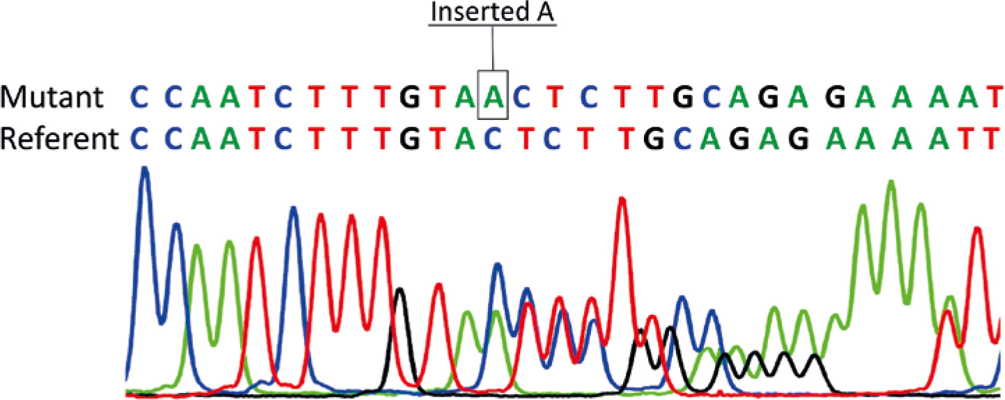 Genetic analysis showed no pathogenic variants in the genes associated with spherocytosis. However, a novel pathogenic variant, c.913dupA, p.Thr305AsnfsTer16 in exon 9 of the FAS gene, was revealed. The same mutation was present in the patient’s mother, but not in her parents (proband’s grandparents). Thus, the pathogenic FAS variant has arisen as a de novo event in the proband’s mother (Fig. 1). Direct sequencing results of exon 9 of the FAS gene are given in Figure 2. Additional laboratory investigations showed increased numbers of CD3+CD4–CD8– T cells (28%), Coombs-positive hemolytic anemia, severe thrombocytopenia, specific biomarkers for ALPS which included hypergammaglobulinemia, elevated level of vitamin B12, hypertriglyceridemia, and hypoalbuminemia. In addition, the proband was found to be a silent carrier of alpha thalassemia (α-3.7) inherited from her father. Clinical findings and laboratory results of the patients are given in Table 1.