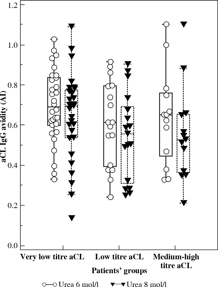 The aCL IgG avidity was determined by the modified ELISA method presented by Vlachoyiannopoulos et al. [23]. In our previous study, we investigated the possibilities of aCL avidity determination using chaotropic agents in detail. We studied the most appropriate dilution of sera and concentration of urea in our modification of ELISA method for aCL avidity determination. The urea concentration of 2 mol/l and 4 mol/l did not disassociate the immune complexes sufficiently, especially if the aCL levels were higher. We found that both urea in concentrations of 6 mol/l or 8 mol/l and sodium chloride in concentrations of 1 mol/l or 2 mol/l were suitable for the sufficient dissociation of immune complexes during an extra step in the ELISA procedure. The extended description of the ELISA for avidity examination using chaotropic agents is shown in Fialová et al. [17, 18]. For the purpose of this study, we used sera diluted 1:50 and urea in concentrations of 6 mol/l and 8 mol/l as a chaotrope. The results of aCL IgG avidity were expressed as the avidity index (AI). It was calculated as a ratio (or percentage) of the residual antibodies bound in the wells in the presence of chaotropic solution (6 mol/l urea or 8 mol/l urea) to the total antibodies bound in the absence of a chaotrope.