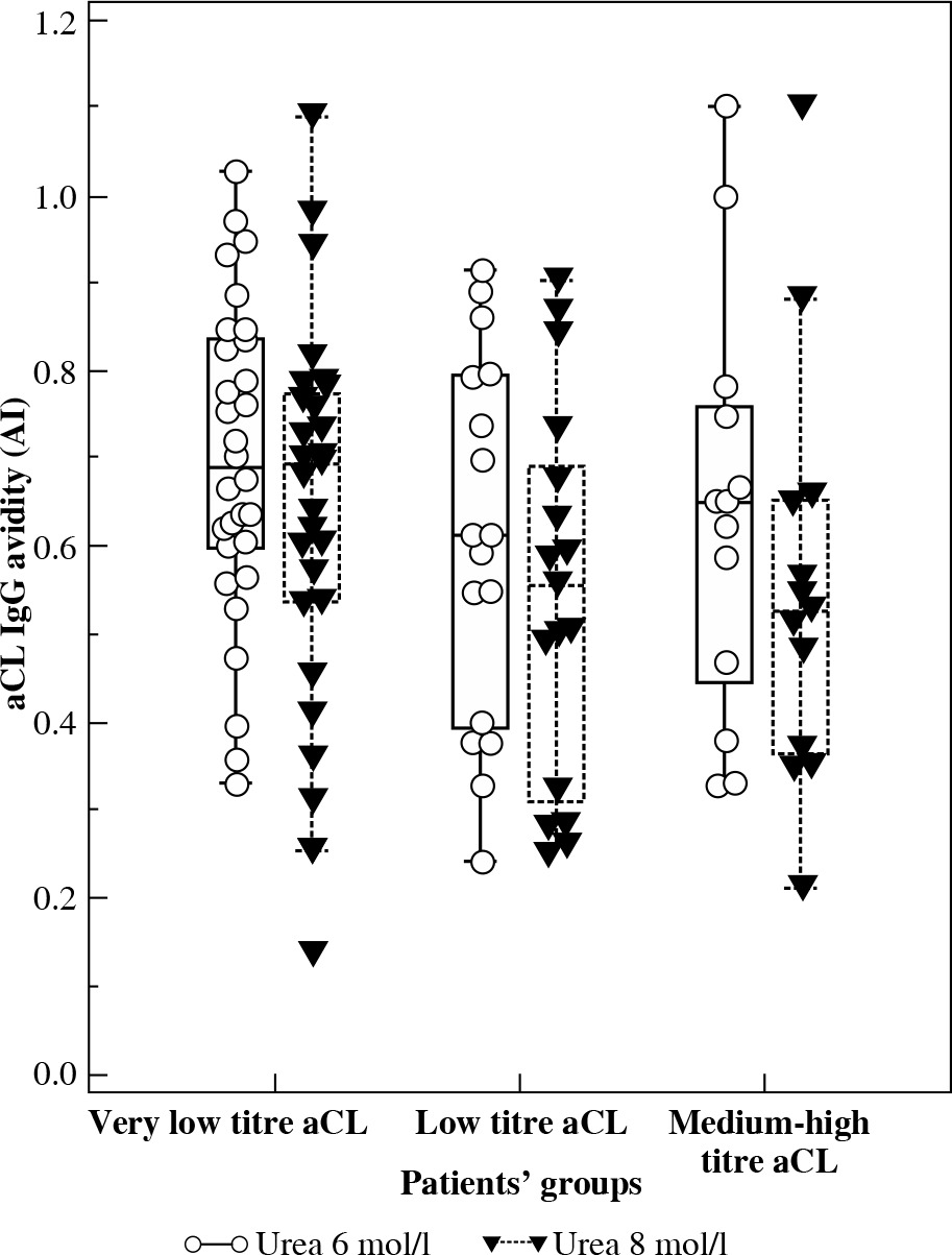 Patients were divided according to aCL IgG levels into three groups: very low level (< 10 GPL; GPL – standardized international units; n = 30), low level (10-40 GPL; n = 17), and medium-high level (> 40 GPL; n = 13). The value of aCL IgG higher than 40 GPL are designated in laboratory criteria for APS as a cut-off for medium to high levels (titers) [6, 29], and value of 10 GPL is a threshold for positive and negative outcomes declared by manufacturers for positive and negative results. If more than one sample was obtained from a patient, the serum values of the first blood sampling were evaluated. Except for one subject, no patient with thrombosis presented aCL level > 10 GPL. SLE or systemic connective tissue disease have been diagnosed in 11 patients, with aCL levels higher than 40 GPL. Figure 1 shows the values of avidity tested in the presence of urea with 6 mol/l and 8 mol/l. The avidity of aCLs did not significantly differ among groups regardless of the urea concentration used for the determination of avidity. Medians of AI were above 0.6 for all groups using urea 6 mol/l in the avidity analysis. An elevation of urea concentration for avidity determination resulted in a moderate decrease of AI medians, but no significant differences among patients’ groups were found.