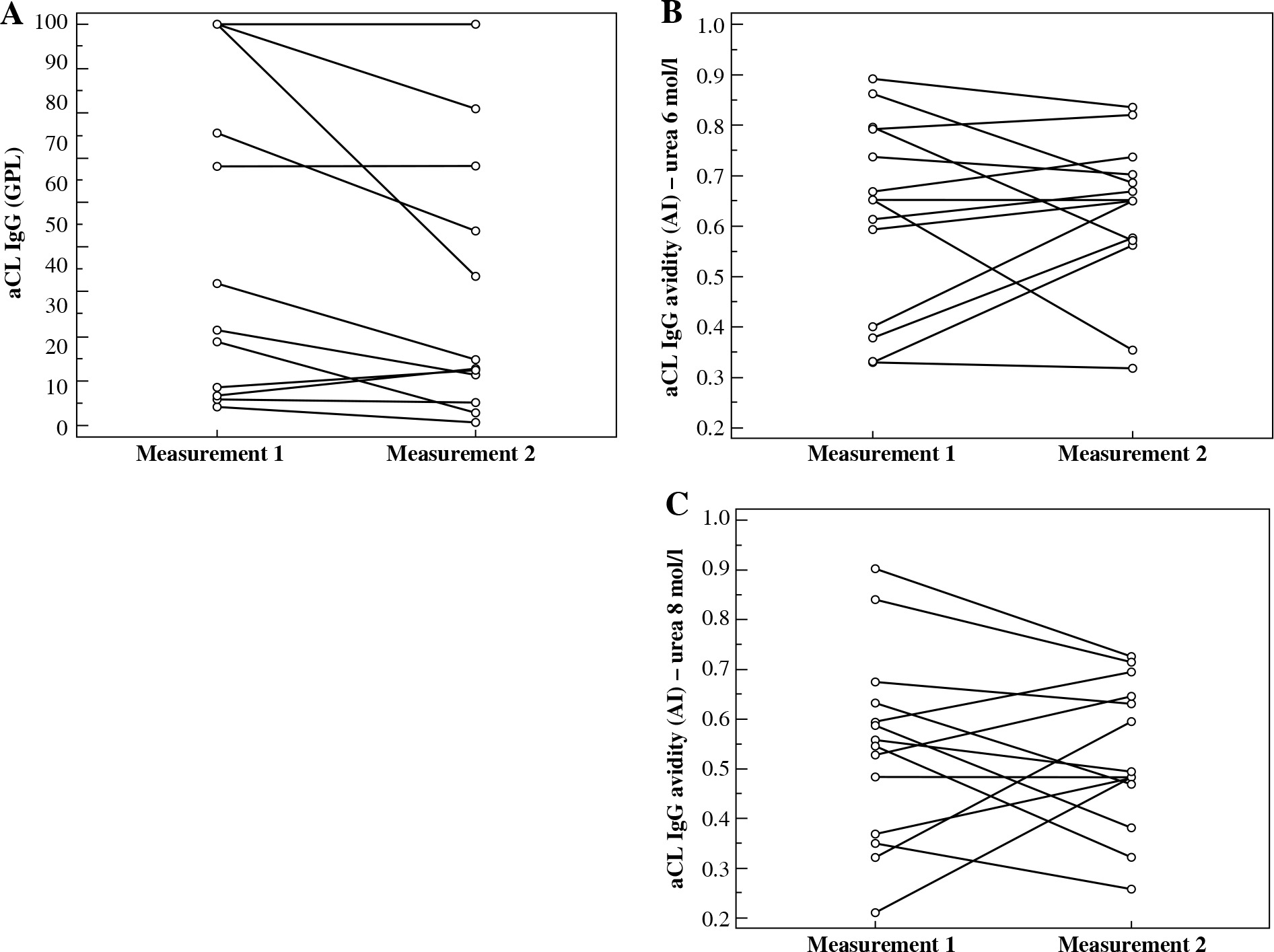 Dynamics of aCL IgG titres and avidities in 14 patients during follow-up. A) Changes in aCL IgG levels; B) Changes of aCL IgG avidities using 6 mol/l urea for avidity determination; C) Changes of aCL IgG avidities using 8 mol/l urea for avidity determination. Neither aCL IgG levels, nor their avidities determined by 6 mol/l urea as well as 8 mol/l urea significantly differ during follow-up