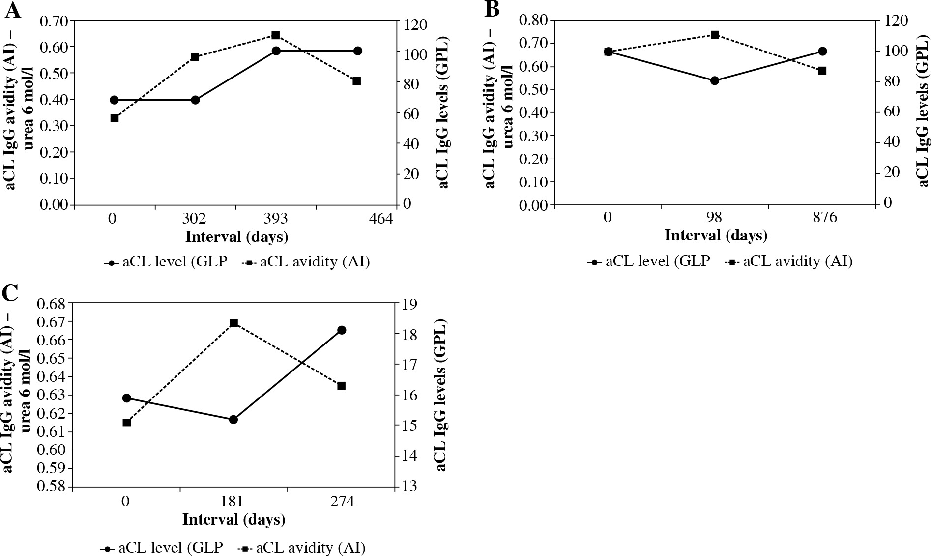 Suwannalai et al. [35] reported that the antibody response against autoantigens does not display avidity maturation, as observed both at baseline and at follow-up. A longitudinal examination in our study showed that the avidity of aCLs remained constant during follow-up. Our observation agrees with findings, which have been reported for several of the other autoantibodies. Cucnik et al. [14] who tested aβ2GPI avidity found no significant changes during the course of thrombotic events and pregnancy complications. Similarly, avidities of anti-citrullinated protein antibodies, anti-glutamate decarboxylase antibodies, or those against insulinoma-associated protein 2 did not exhibit extensive avidity maturation [35, 38, 39]. However, fluctuation of avidity has also been described. Avidities of anti-Hu and anti-Yo onconeural antibodies increased or remained invariable during the course of oncological diseases [40].