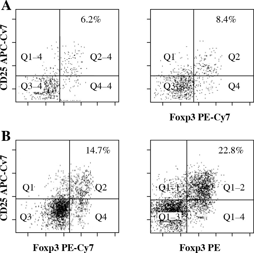 Regulatory T cells (Tregs) play a significant role in preventing development of autoimmune diseases by suppression of activation, proliferation, or differentiation of many subpopulations of immunocompetent cells, including mast cells [1], CD4+ [2] and CD8+ T cells, natural killer cells [3], and B cells [4]. However, it is strongly suggested that the major target of suppressive activity of Tregs are dendritic cells (DCs) [2], as Tregs strongly suppress DCs maturation [5]. Tregs constitute 5-15% of peripheral CD4+ T cells in both mice and humans, which are identified by the expression of interleukin 2 receptor α-chain – CD25 [6, 7] and the nuclear marker Foxp3, which is an essential factor for development and function of Tregs [8, 9].
