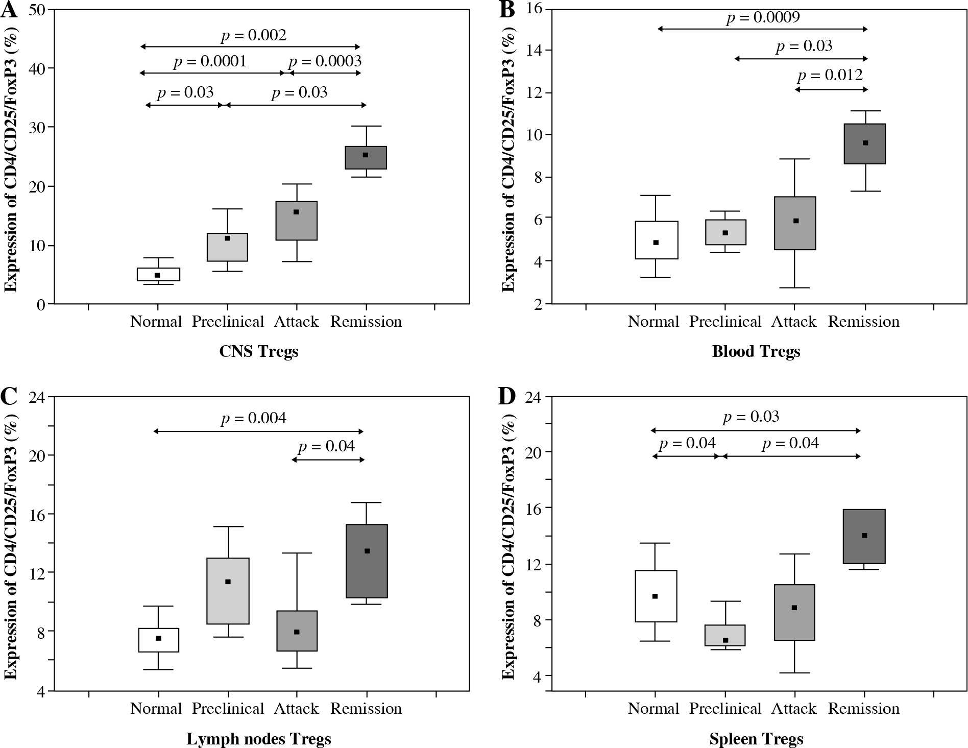Accumulation of Tregs during three consecutive phases of experimental autoimmune encephalomyelitis (EAE) (preclinical, initial attack, and remission) in the central nervous system (CNS) (A), blood (B), lymph nodes (C), and spleen (D) analyzed by flow cytometry. Cells from the CNS of control unimmunized mice were pooled from 6 mice. Data is derived from a CD4+ cell gate, n = 14 per group, Mann-Whitney test with Bonferroni correction