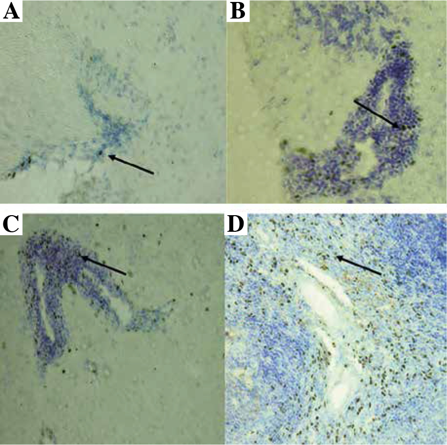 Localization of Tregs (Foxp3-positive cells) (brown cells, arrows) in the brain and spleen of experimental autoimmune encephalomyelitis (EAE) mice. Staining was developed using diaminobenzidine substrate and sections were counterstained with hematoxylin and eosin. Representative brain sections are shown from: healthy control (A), initial attack (B), and remission (C) of the disease; section from the spleen (D) served as a positive control for staining (original magnification 20×)