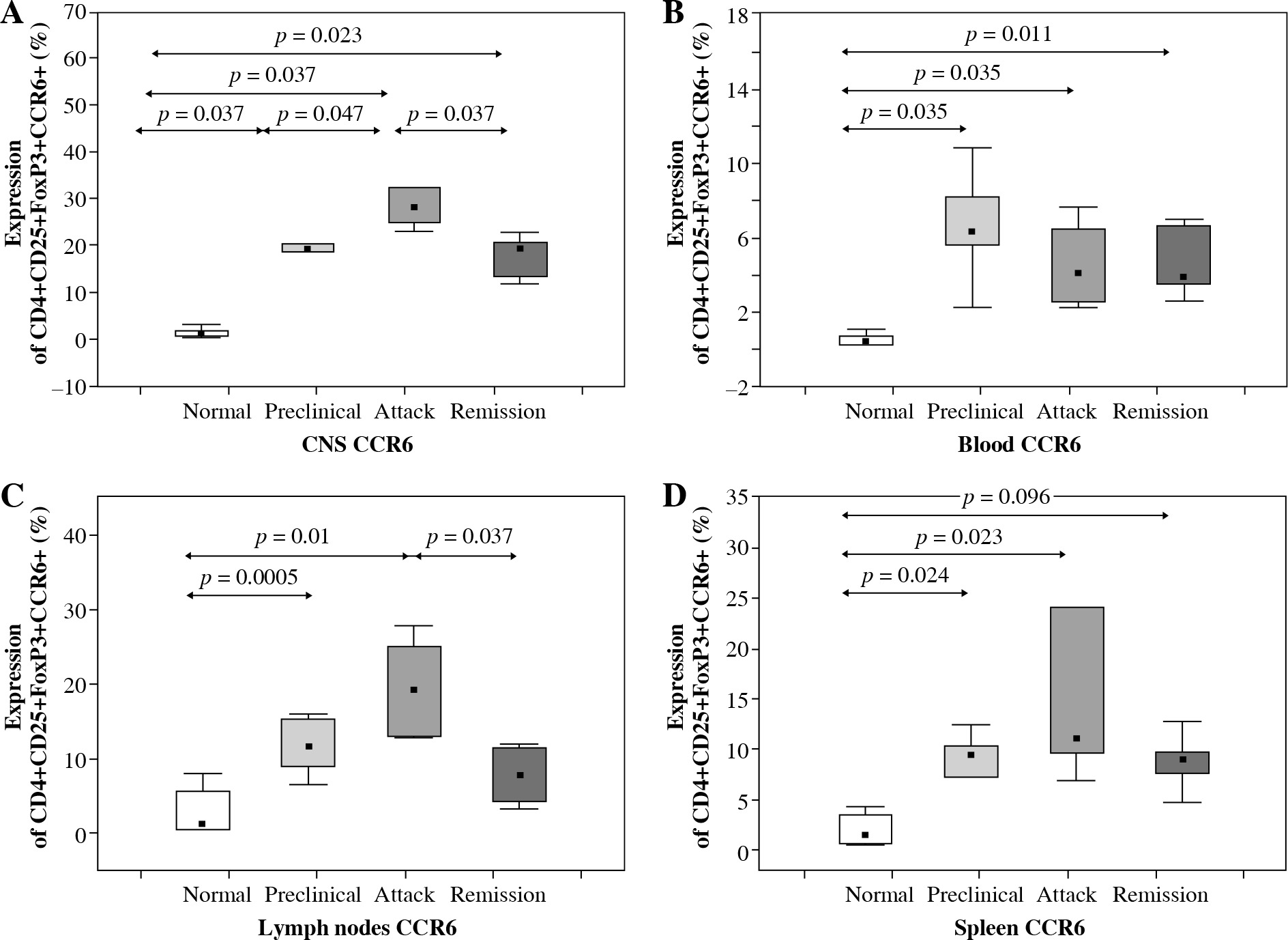 CCR6 protein expression on Tregs from the central nervous system (CNS) (A), blood (B), lymph nodes (C), and spleen (D) of animals from preclinical phase, initial attack, and remission of experimental autoimmune encephalomyelitis (EAE) assessed by flow cytometry. Data is derived from a CD4+ Foxp3+ cell gate, n = 7 per group, Mann-Whitney test with Bonferroni correction
