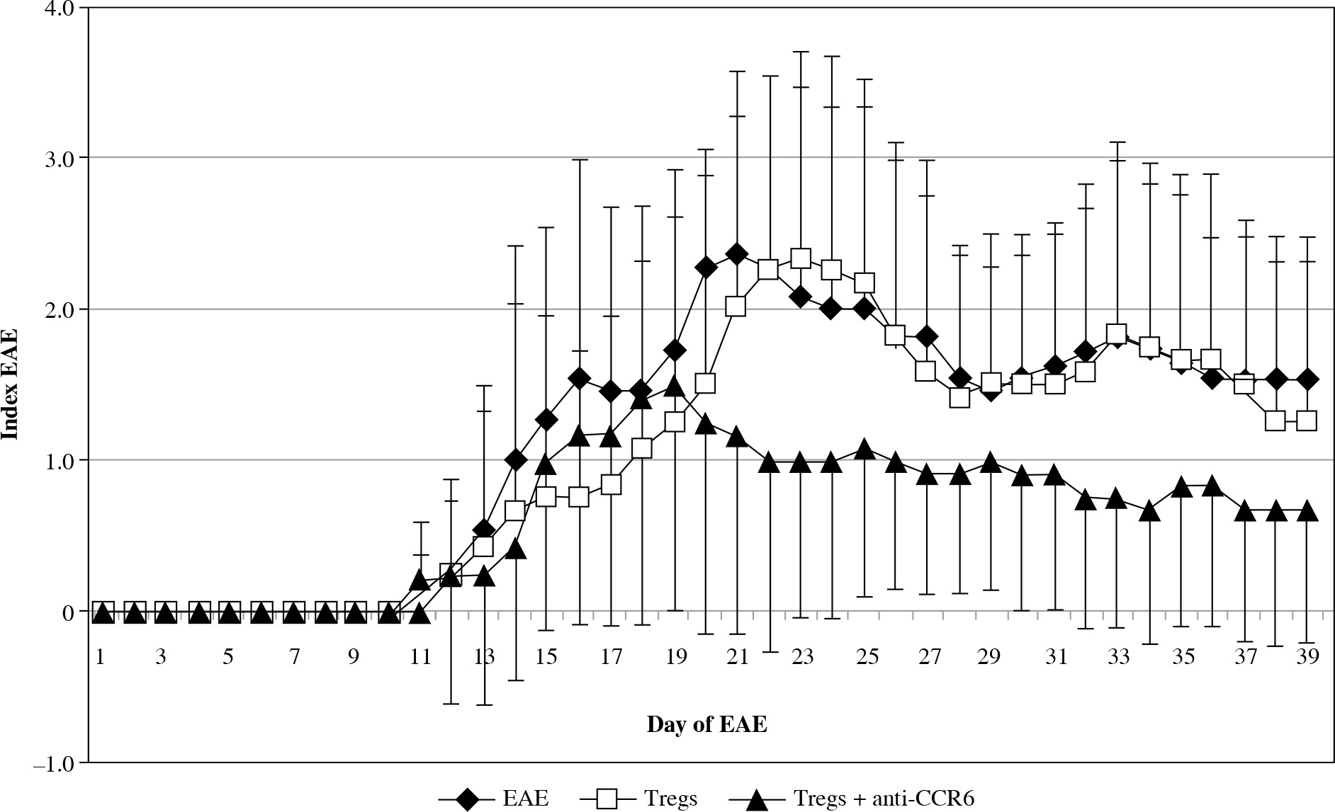 Modulation of experimental autoimmune encephalomyelitis (EAE) clinical course by passive transfer of Tregs or Tregs with blocked CCR6. Tregs were isolated and blocked as described in “Material and methods” section. Data is expressed as the mean index of EAE for all mice in each group. Bars shows SD (EAE – unmanipulated EAE group used as morbidity control, Tregs – EAE group which received unblocked Tregs, Tregs + anti-CCR6 – EAE group which received Tregs with blocked CCR6)