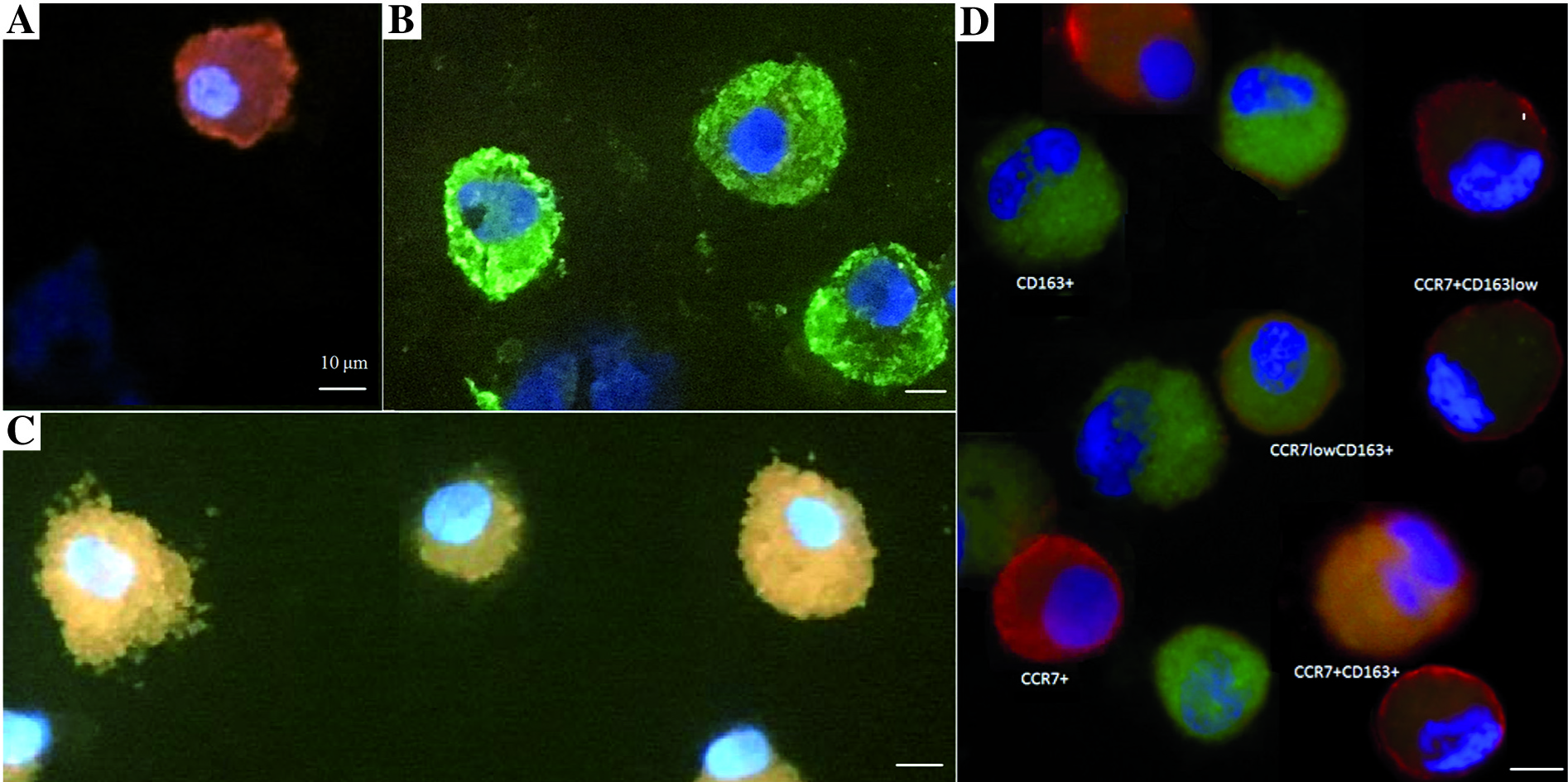 Result of immunofluorescence reaction for CCR7 and CD163 markers: A) macrophages with a positive reaction for one marker: CCR7+ macrophages, B) macrophages with a positive reaction for one marker: CD163+ macrophages, C) double-stained macrophages CCR7+ CD163+, D) example of all reactions for one patient. A microscope photo, scale bars: 10 μm. Immunofluorescence examination was performed in all 36 samples: 18 of the BALF from lung with cancer and 18 of the BALF from ‘healthy’ lung. The image of macrophages with reaction to CCR7 and CD163 was comparable in each slide. Here we present the examples of these reactions