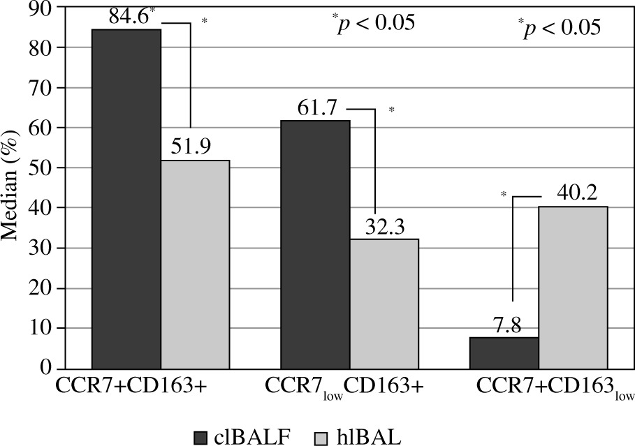 Median proportion of macrophage subpopulations in bronchoalveolar lavage fluid (BALF) of lung cancer patients from the lung affected by cancer (clBALF) and from the healthy symmetrical lung (hlBALF). The proportion of double stained cells: CCR7+CD163+ as a proportion of all macrophages is presented (first column). The subpopulations CCR7low+CD163+ and CCR7+CD163low are presented as a proportion of CCR7+CD163 cells (second and third column). (* p < 0.05). Data are presented as median values