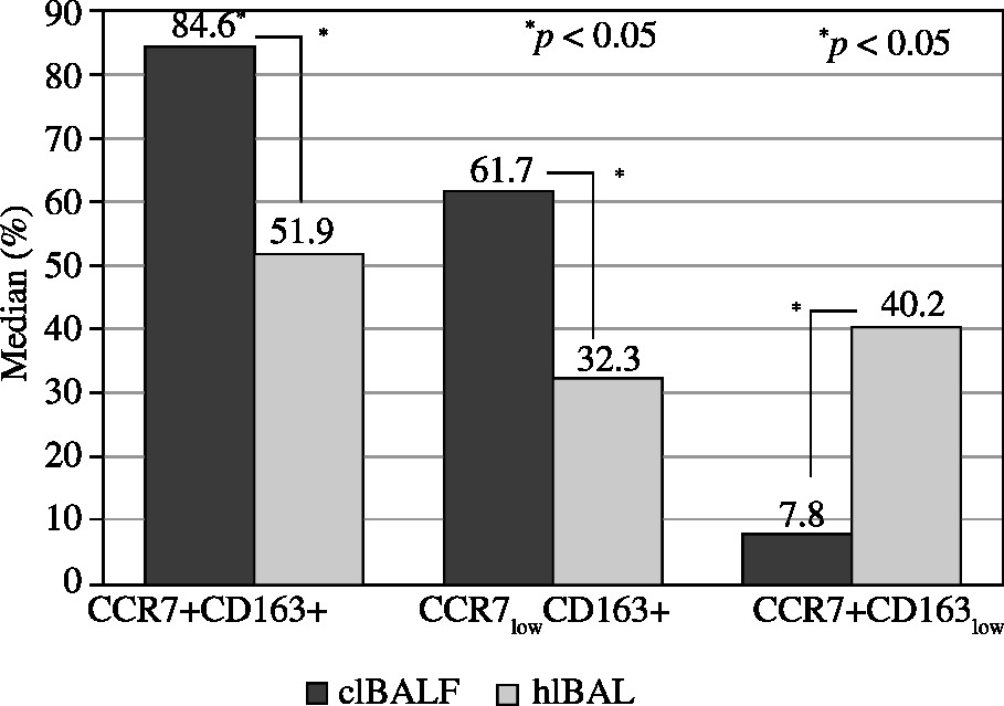 There was a positive significant correlation between the proportion of CD163+ macrophages and TGF-β1 concentration in the clBALF (r = 0.6, p < 0.05) but not in the hlBALF. In the hlBALF we observed a positive significant correlation between the proportion of CCR7+ macrophages and the TGF-β1 concentration (r = 0.6, p < 0.05) and between TGF-β1 concentration and proportion of CCR7+CD163low cells (r = 0.6, p < 0.05). This observation should be interpreted with caution because the proportion of cells is low.