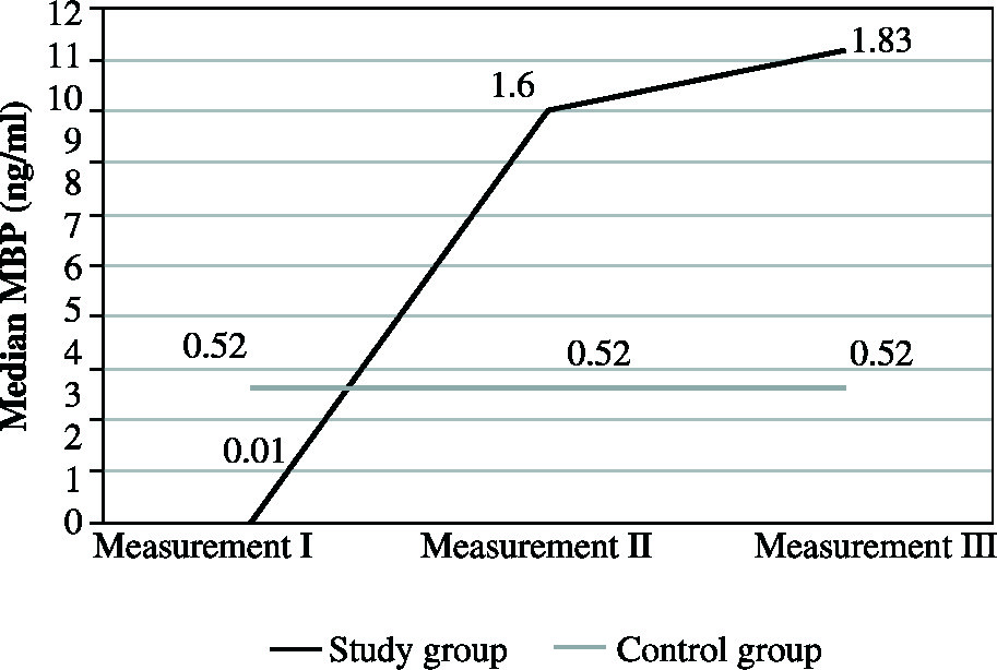 The study involved 30 pediatric patients (16 male and 14 female, gender ratio M : F = 1.14 : 1). The average age of patients was 8.4 months (standard deviation [SD] ±5.8 months). The control group included 30 pediatric patients who underwent first-time VPS implantation (measurement-control). It consisted of 17 male and 14 female patients (gender ratio M:F = 1.21:1). The average age of patients was 1.2 months, SD ±0.3. The first sample of CSF (measurement I) was taken at diagnosis (clinical symptoms of VPS malfunction and positive CSF culture). The mean level of MBP was 2.63 ng/ml, SD ±12.8 ng/ml, and the median value 0.01 ng/ml. It was significantly lower (p = 0.003) compared to the MBP levels in the control group, where the mean value was 2.63 ng/ml, SD ±4.56 ng/ml, and median 0.52ng/ml (Fig. 1, Tables 1 and 2). After identification of the etiological factor, which in all cases was Staphylococcus epidermidis, removal of VPS and the implantation of EVD was performed. Proper targeted antibiotic therapy was implemented. In all cases,it was 5 mg of vancomycin intraventricular every 24 h. The mean duration of antibiotic therapy was 20.2 days, SD ±7.9 days. When condition of three sterile CSF cultures was fulfilled, the second CSF sample was taken - measurement II. Median MBP concentration at the second measurement was 1.60 ng/ml, whereas the mean level was 49.48 ng/ml,SD ±237.73 ng/ml (Fig. 1, Tables 1 and 2). In all CSF samples, MBP levels were significantly elevated in comparison to the first measurement, and this was true also for the control group. But there was no statistically significant difference sample from the second measurement in comparison to the control group (p = 0.246) (Fig. 1, Tables 1 and 2), and at this time, antibiotic therapy was maintained. From this point, in all cases, we waited until the time of the normalization of protein and pleocytosis values. It took on average 23.8 days, SD ±5.27 days. Once the conditions were fulfilled, the implantation of new VPS was performed. The third CSF sample was taken during surgical procedure – measurement III. At the time of VPS, implantation the average level of MBP in CSF was 4.55 ng/ml, SD ±7.19 ng/ml,and median 1.83 ng/ml (Fig. 1, Tables 1 and 2). It was higher than in the first measurement (p = 0.002) and in the control group (p = 0.036) (Fig. 1, Tables 1 and 2). Average CSF MBP level in control group was 2.63 ng/ml, SD ±4.56 ng/ml, and median 0.52 ng/ml (Fig. 1, Tables 1 and 2). Levels were higher than in the first (p = 0.003) and lower in the third measurement (p = 0.036) of the study group (Fig. 1).